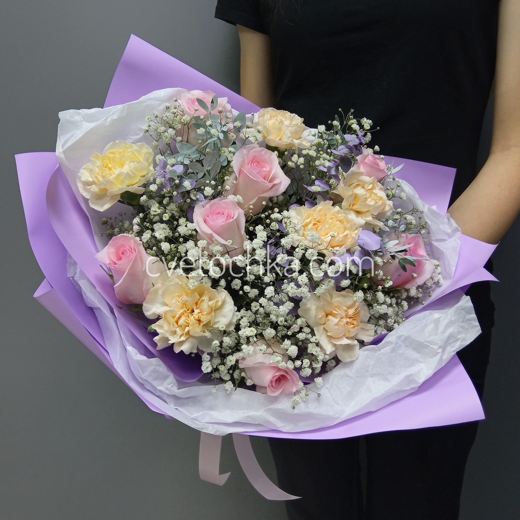 Роскошный букет из нежно-розовых роз, кремовых гвоздик, воздушной гипсофилы с акцентами эвкалипта и фисташки. Идеально подходит для романтических признаний, нежных поздравлений или просто для создания хорошего настроения.