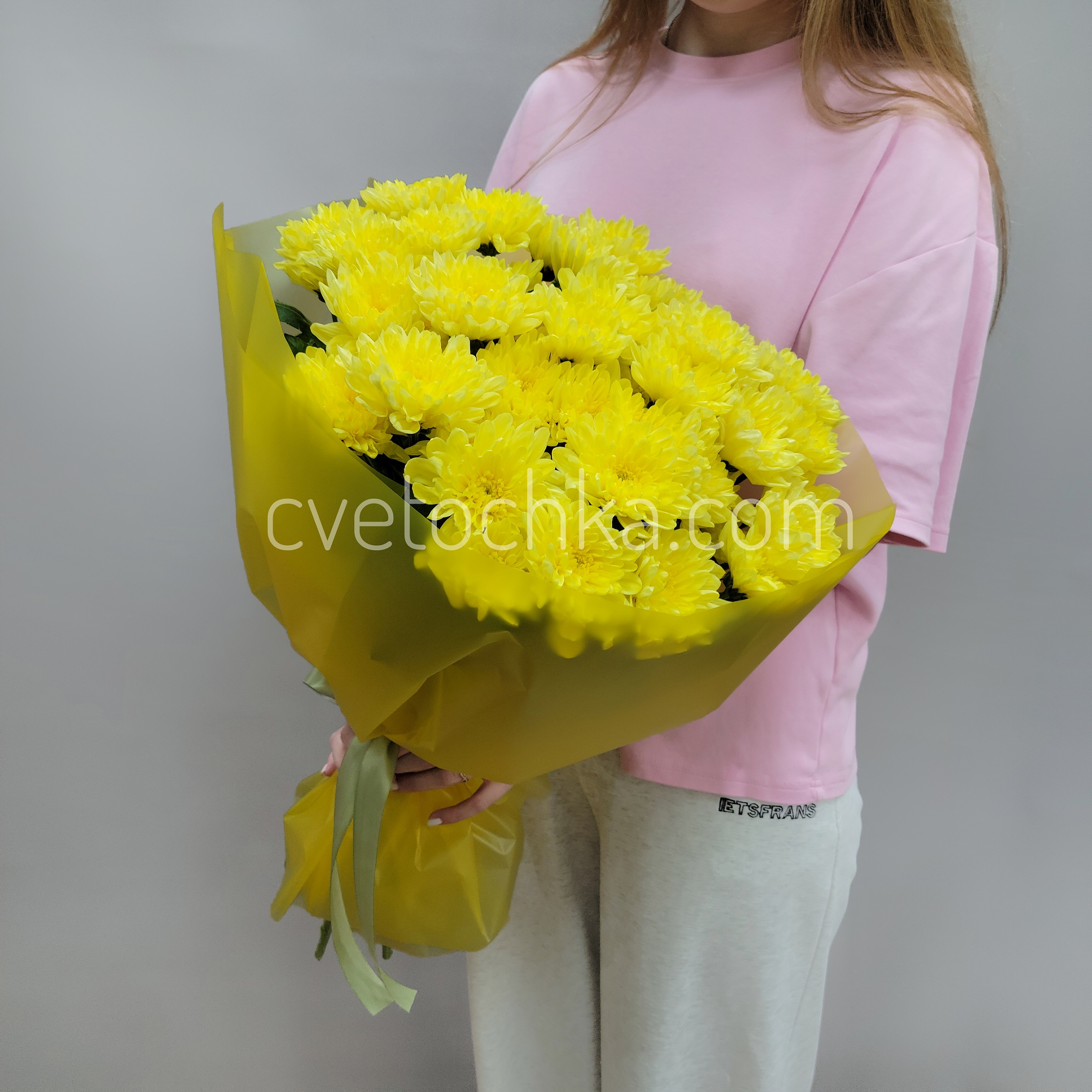 Цвет хризантем - на выбор из наличия, возможна замена расцветок в зависимости от Ваших пожеланий и представленного ассортимента. Варианты расцветок менеджер предложит при подтверждении заказа или уточняйте заранее написать в Telegram