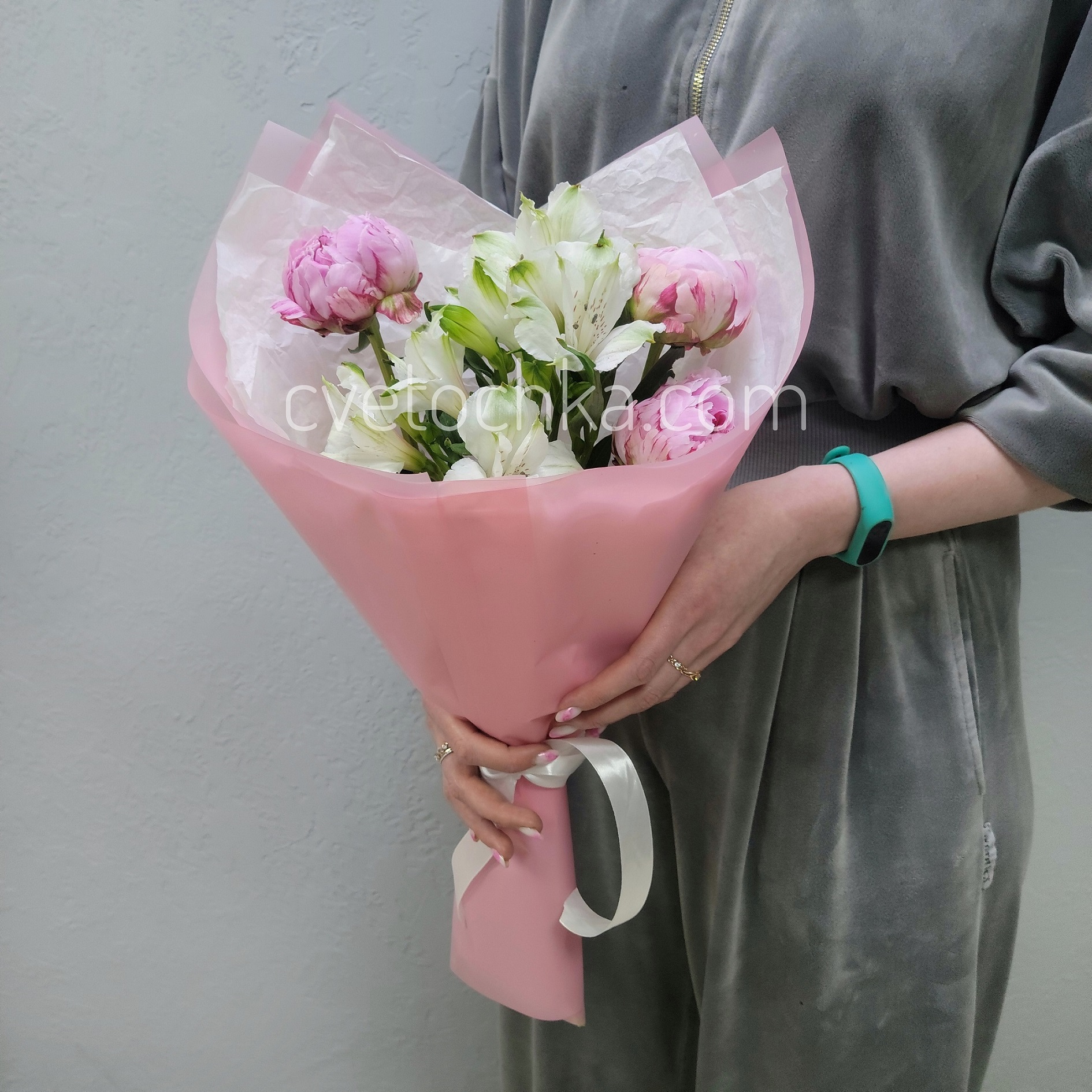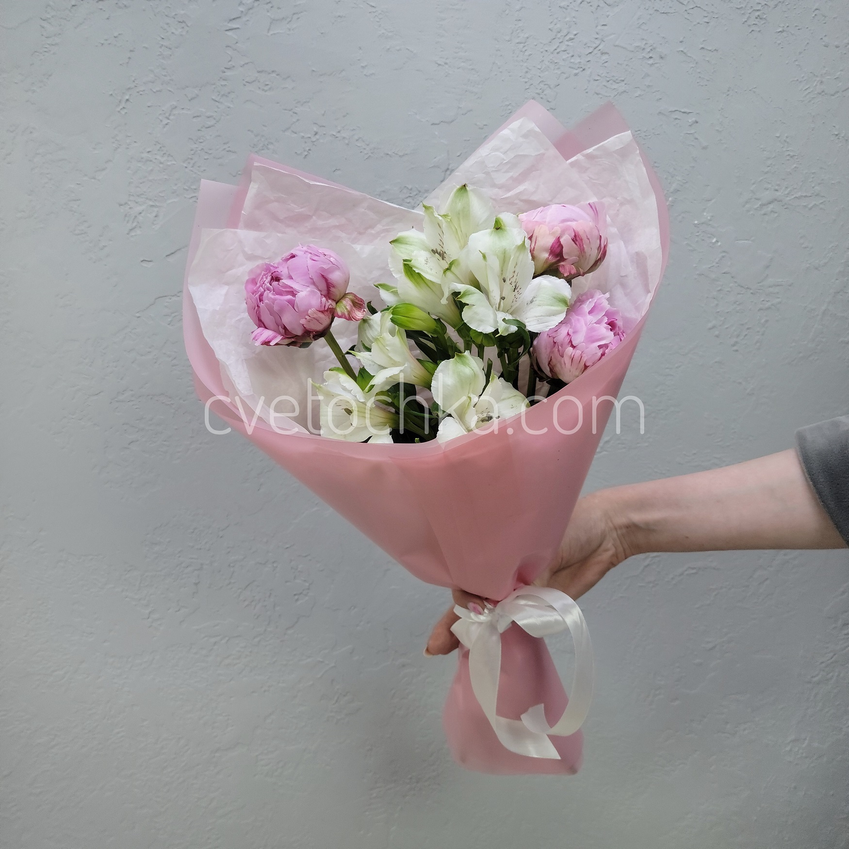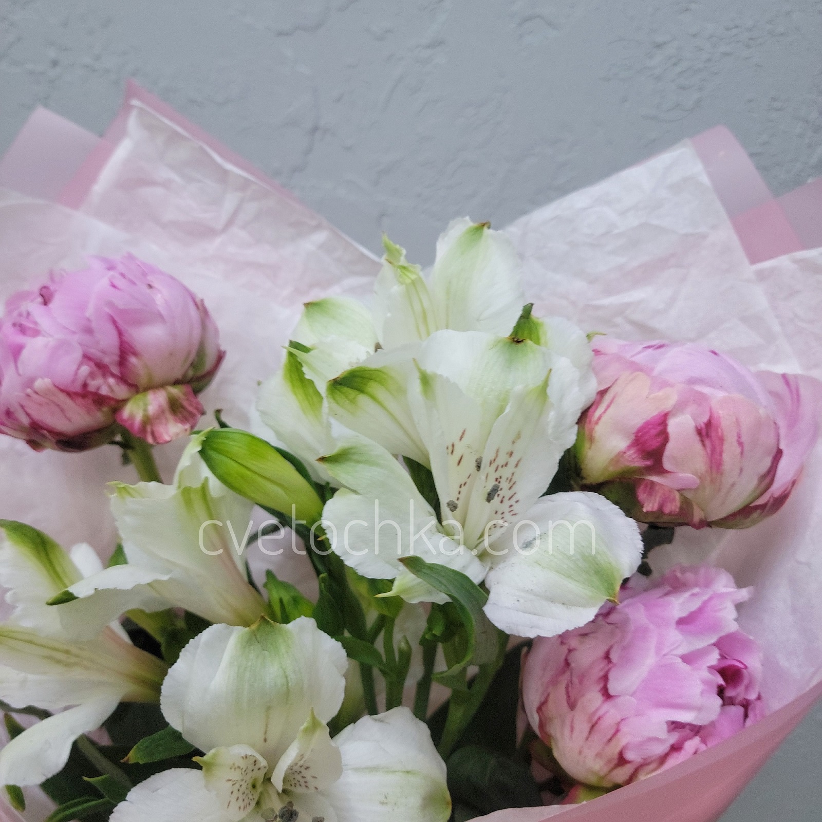 Вы можете купить букет-комплимент из пионов и альстромерий с доставкой в Челябинске или оформить самовывоз из любого нашего магазина.