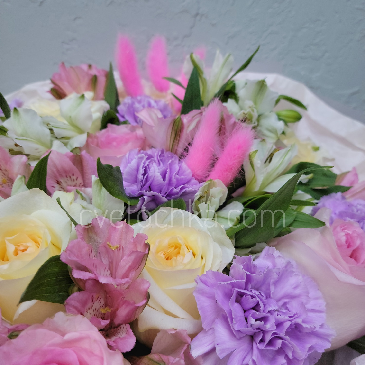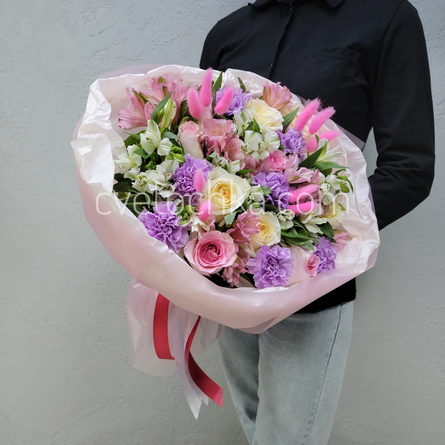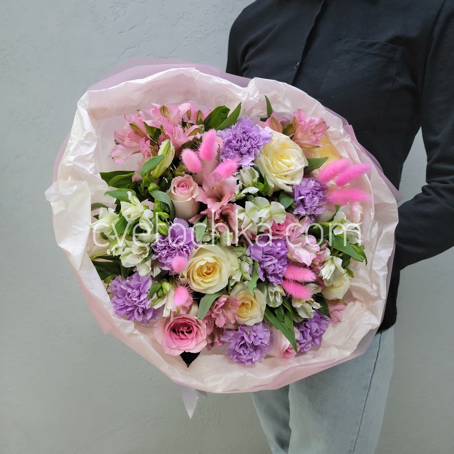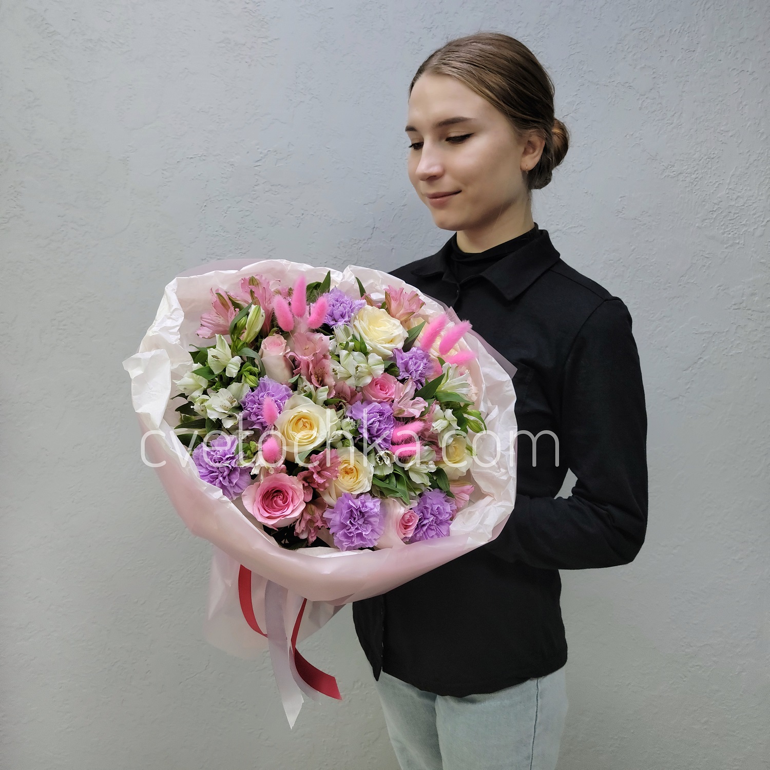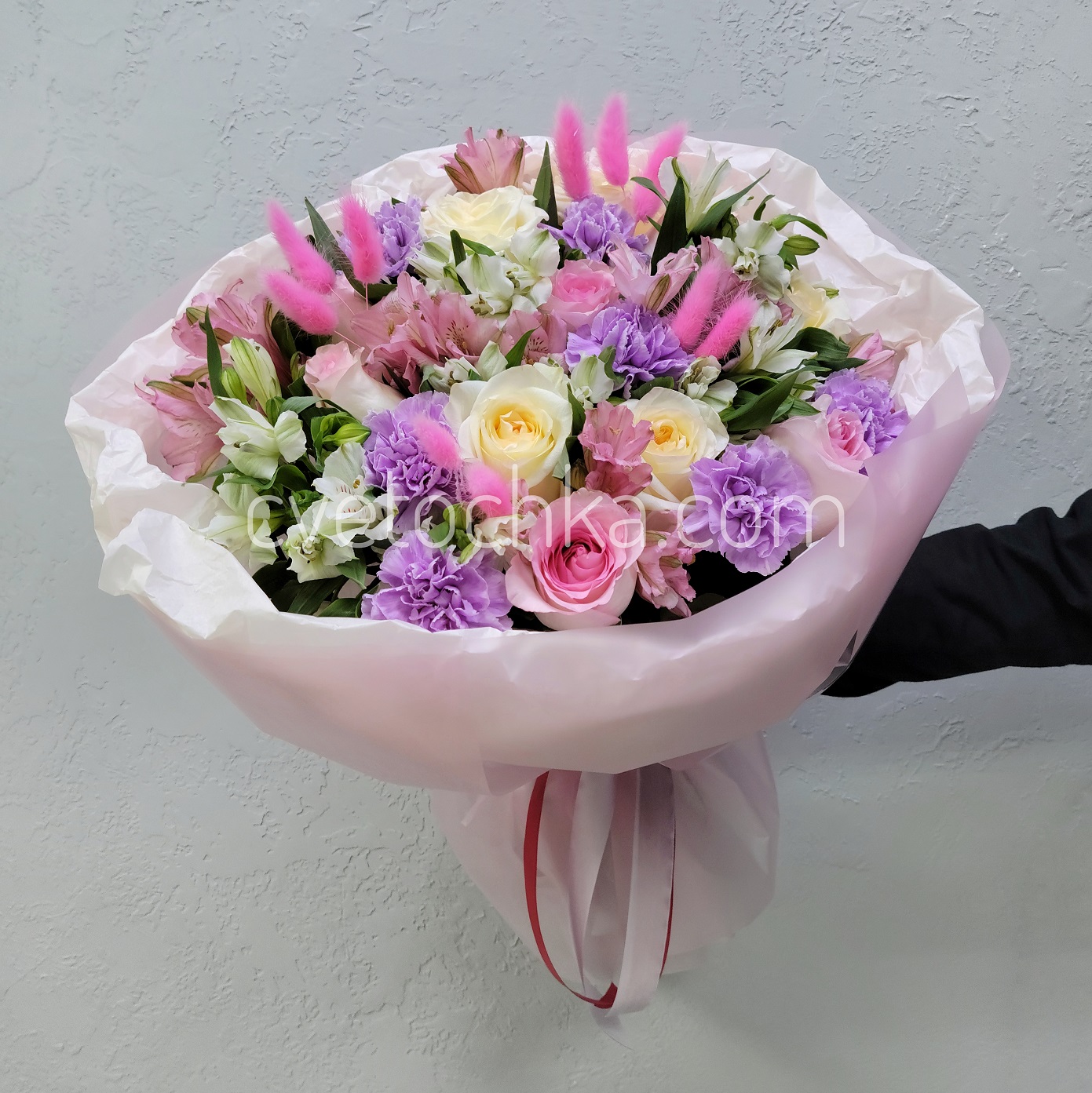 Вы можете купить букет с розами, альстромериями и гвоздиками с доставкой в Челябинске или оформить самовывоз из любого нашего магазина.