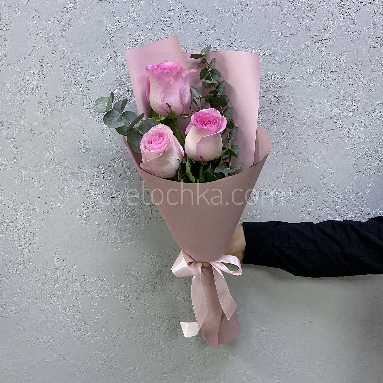 Вы можете купить букет из трех роз с эвкалиптом с доставкой в Челябинске или оформить самовывоз из любого нашего магазина – порадуйте близких нежным знаком внимания