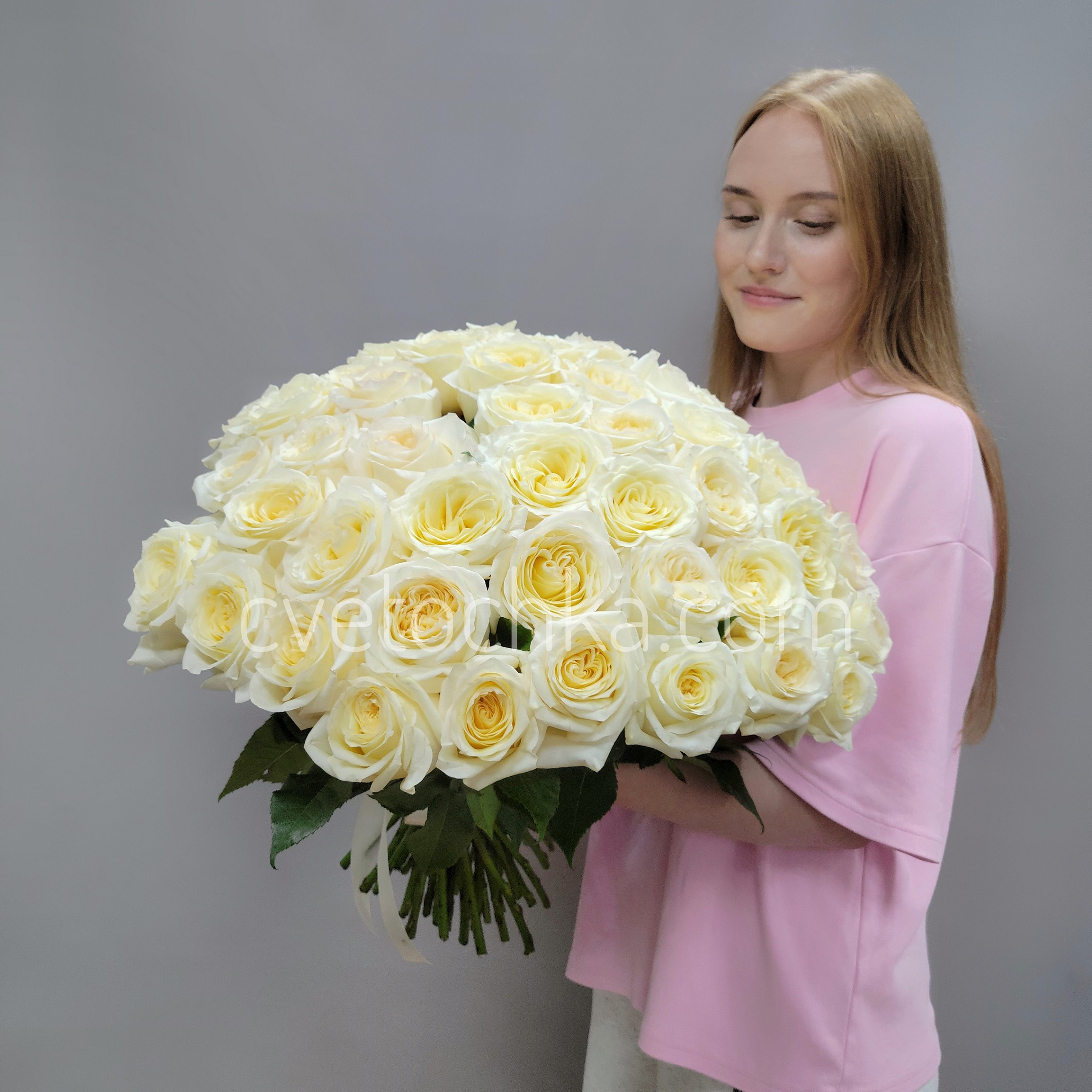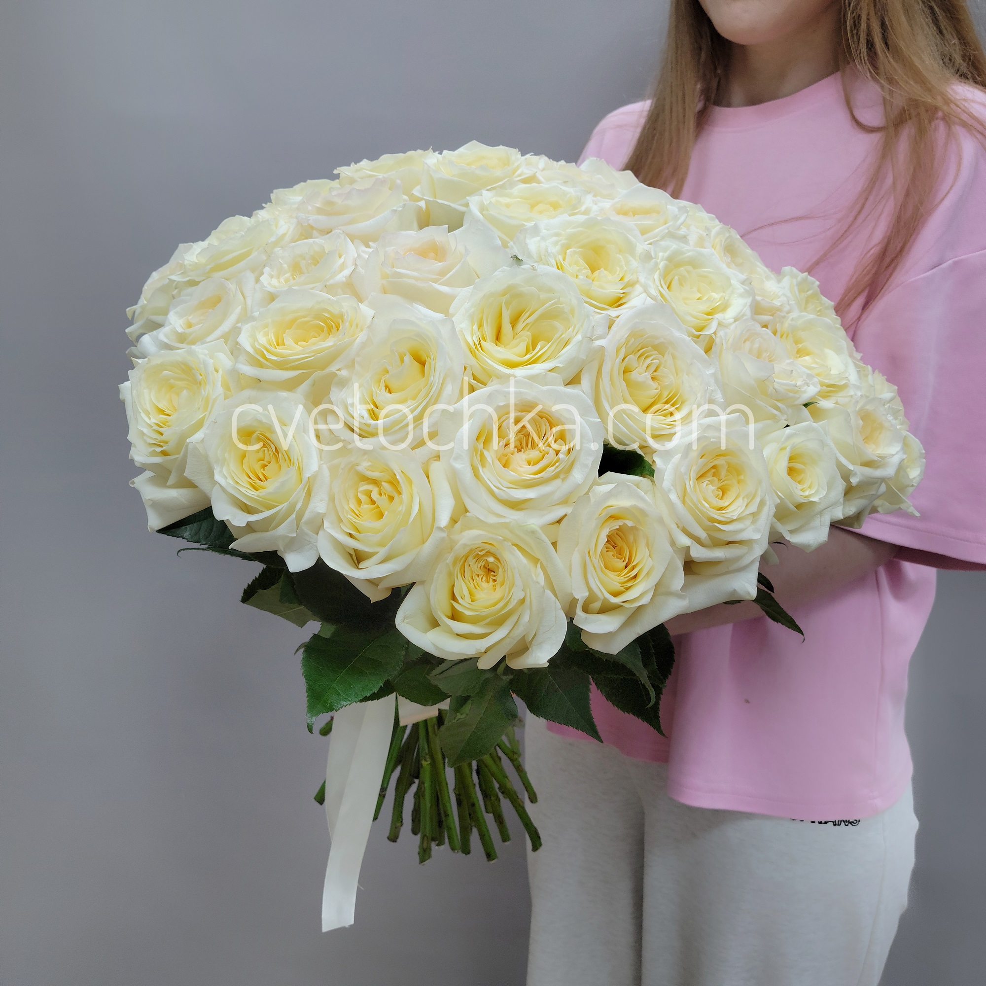 Сливочные розы из Эквадора - эталон качества. Это розы с крупным бутоном премиум-класса с плотными бархатными лепестками благородного кремового оттенка и длиной стебля 50 см. Они символизируют гармонию, совершенство и искреннюю заботу.
