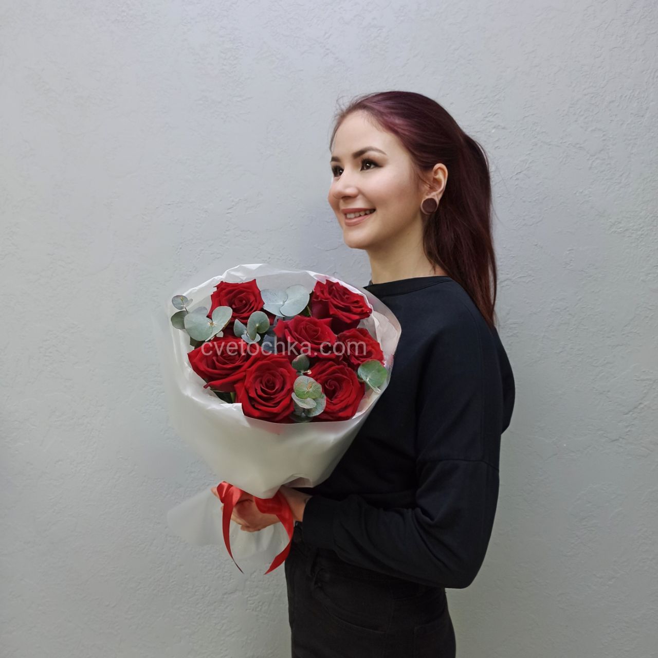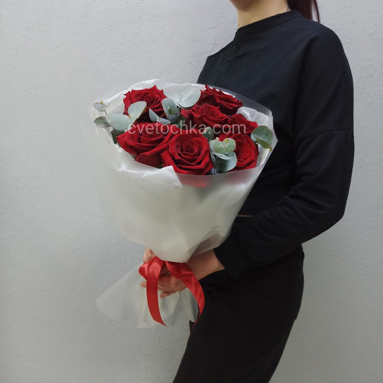 Вы можете купить букет из 7 роз с эвкалиптом с доставкой в Челябинске или оформить самовывоз из любого нашего магазина – порадуйте близких нежным знаком внимания
