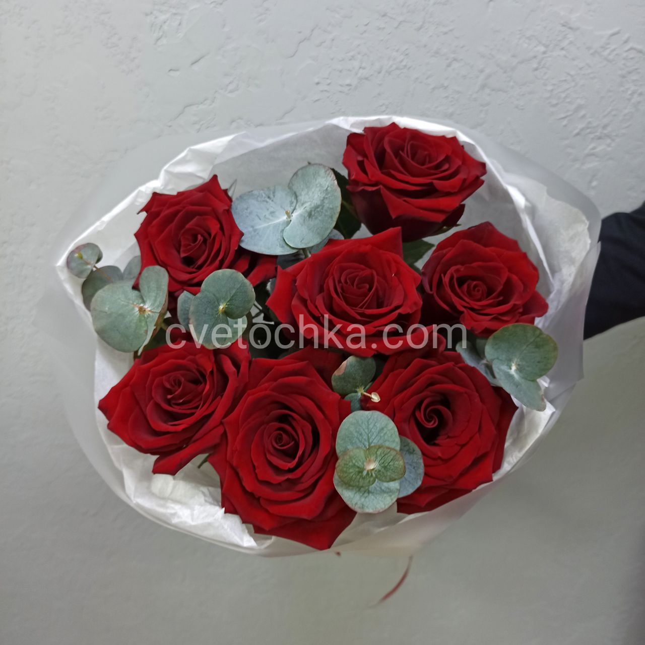 Букет из 7 красных роз с эвкалиптом