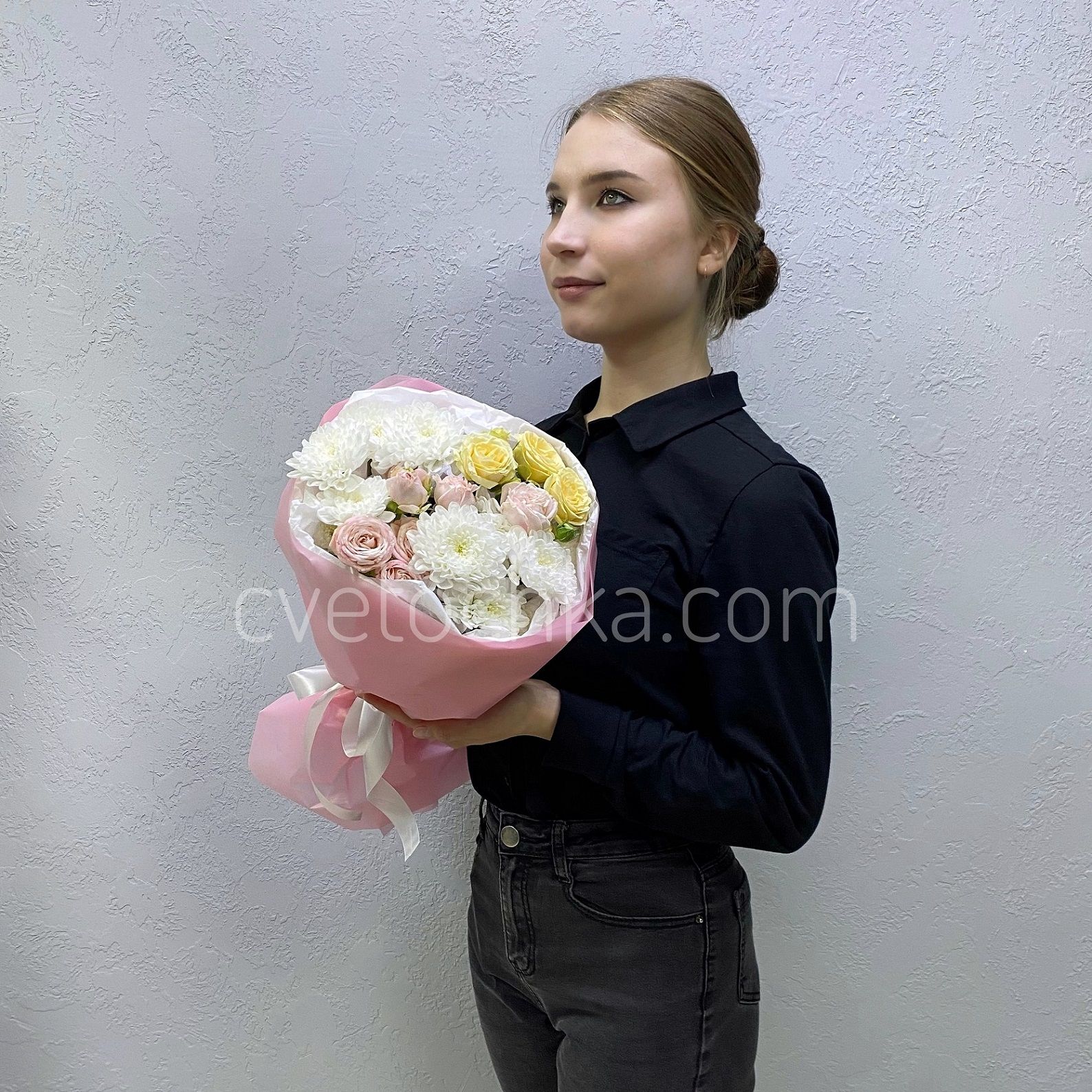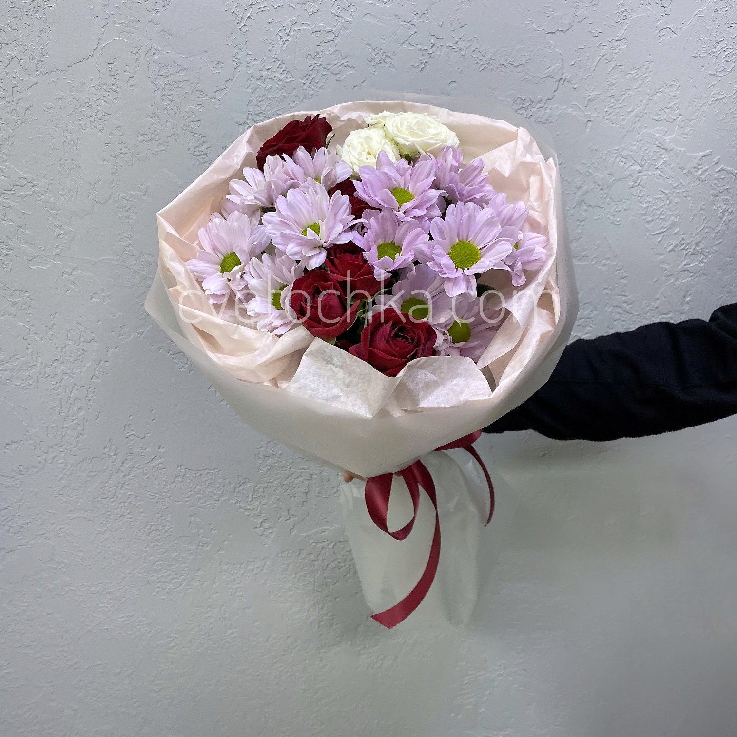 Вы можете купить небольшой букет из хризантем и кустовых роз с доставкой в Челябинске или оформить самовывоз из любого нашего магазина.