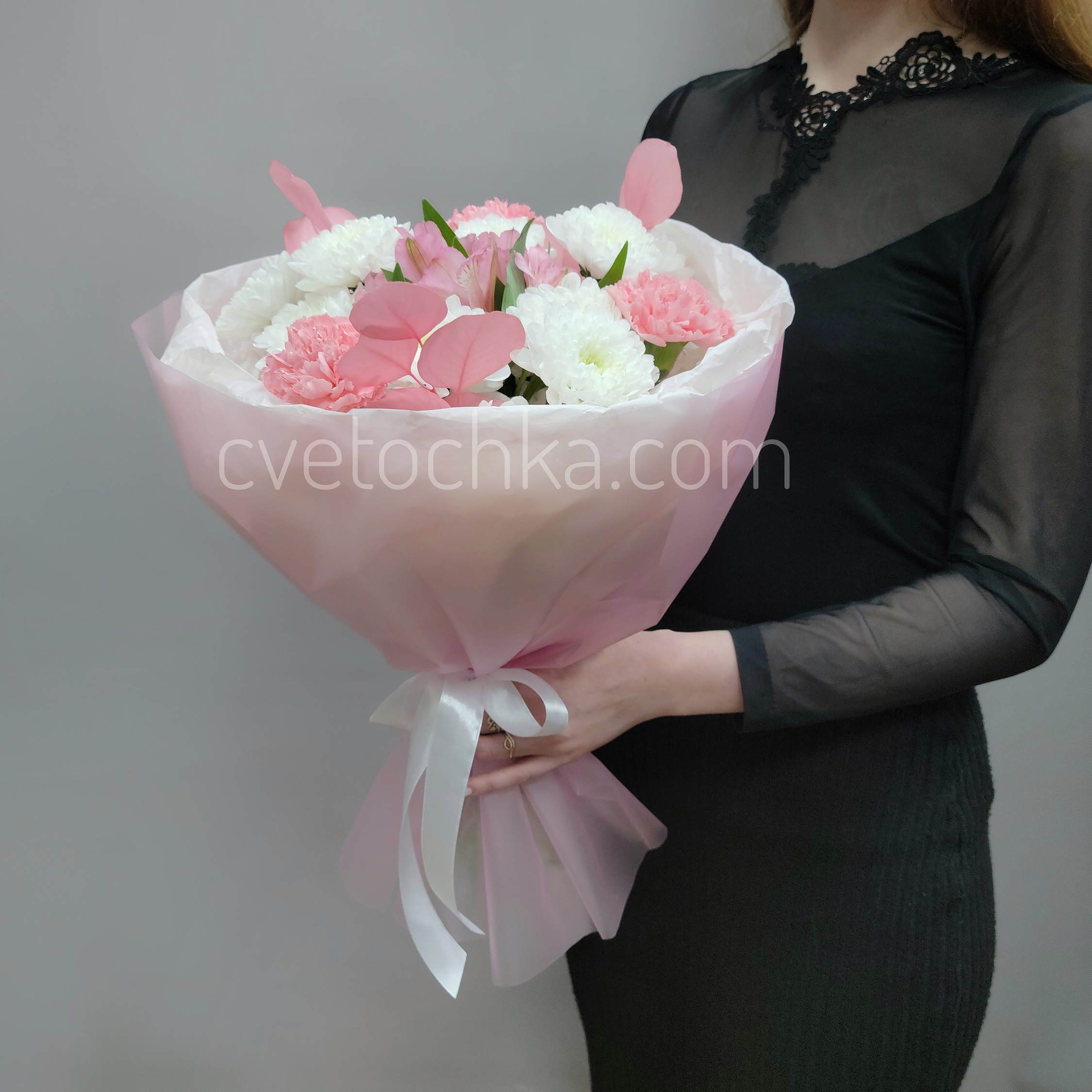 Вы можете купить нежный букет из кустовых хризантем, гвоздик и альстромерий с доставкой в Челябинске или оформить самовывоз из любого нашего магазина.
