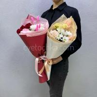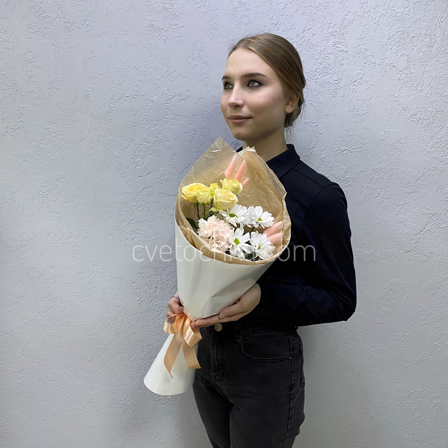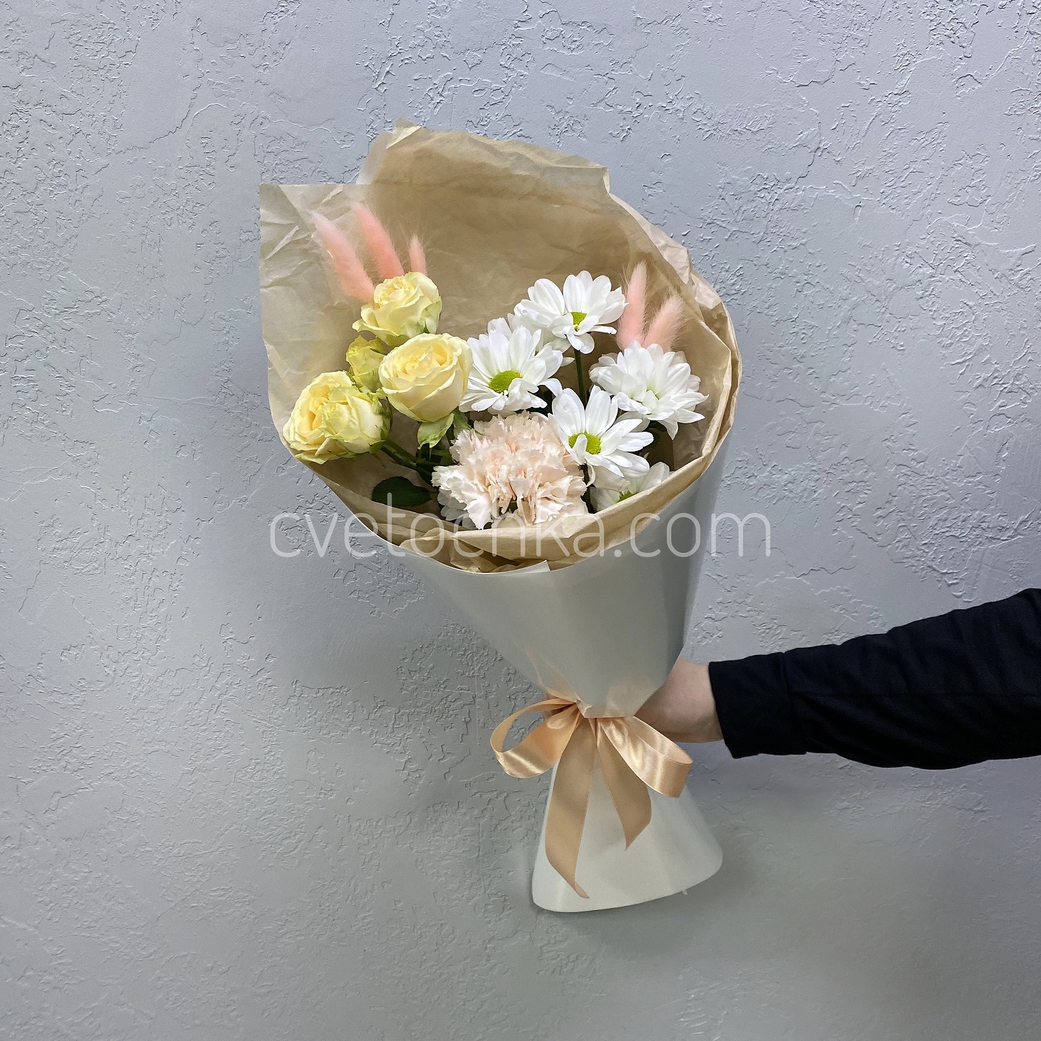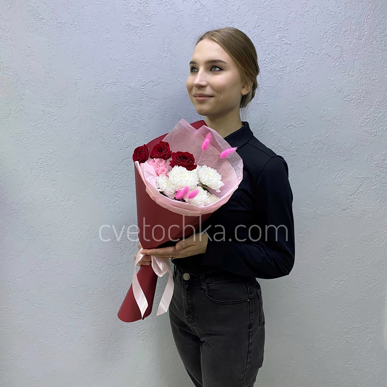 Вы можете купить небольшой букет из хризантемы, кустовой розы и гвоздики с доставкой в Челябинске или оформить самовывоз из любого нашего магазина.