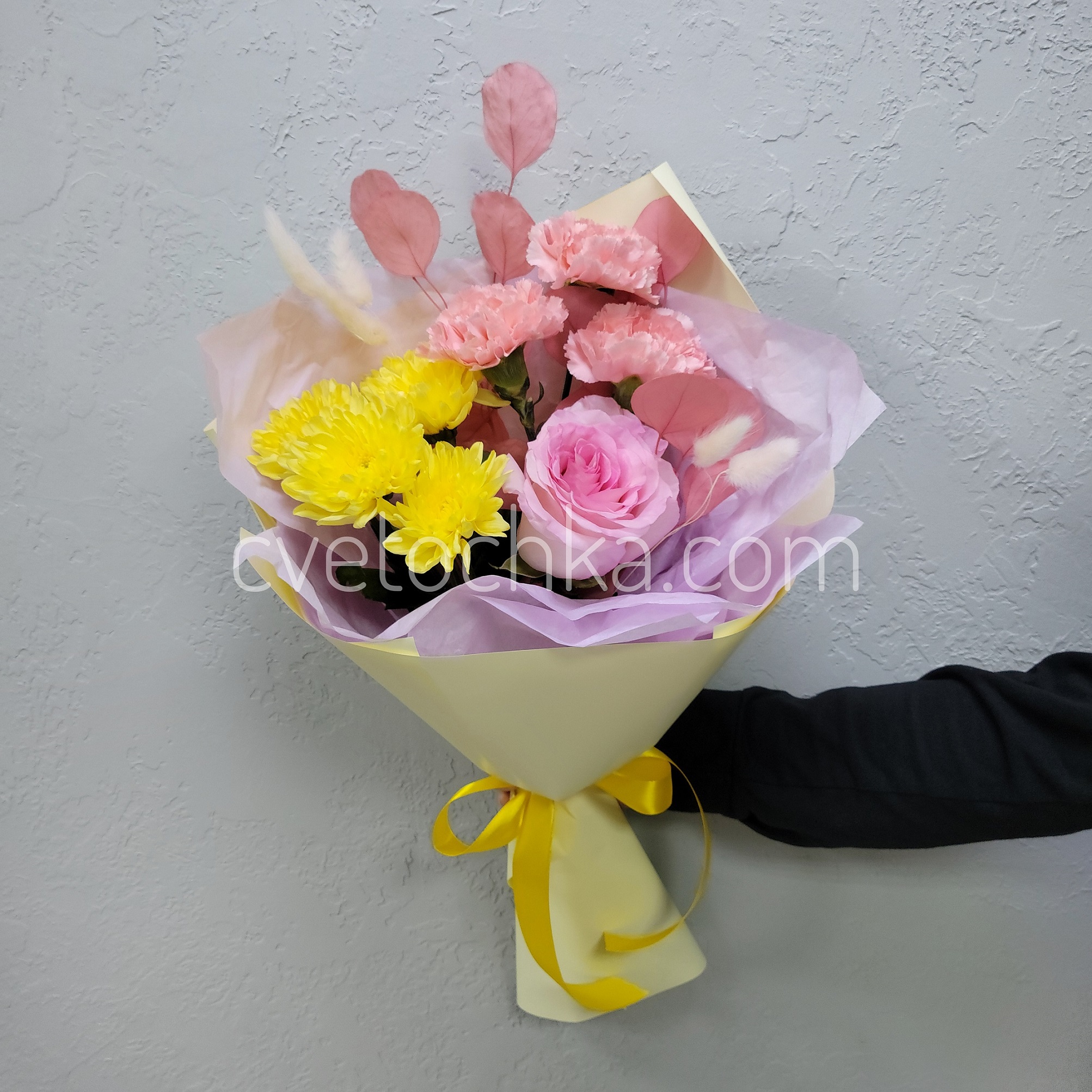 Вы можете купить небольшой букет с розой и кустовой хризантемой с доставкой в Челябинске или оформить самовывоз из любого нашего магазина.