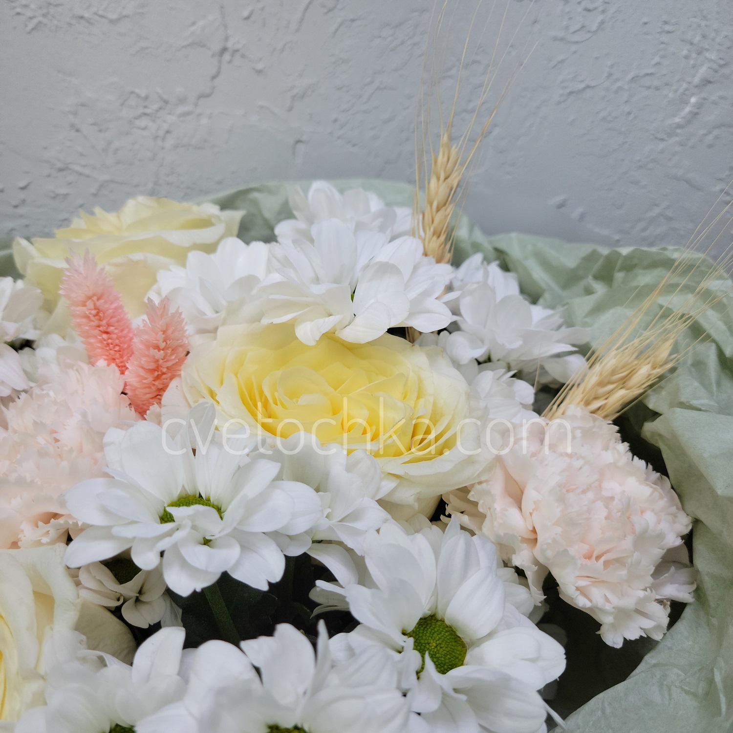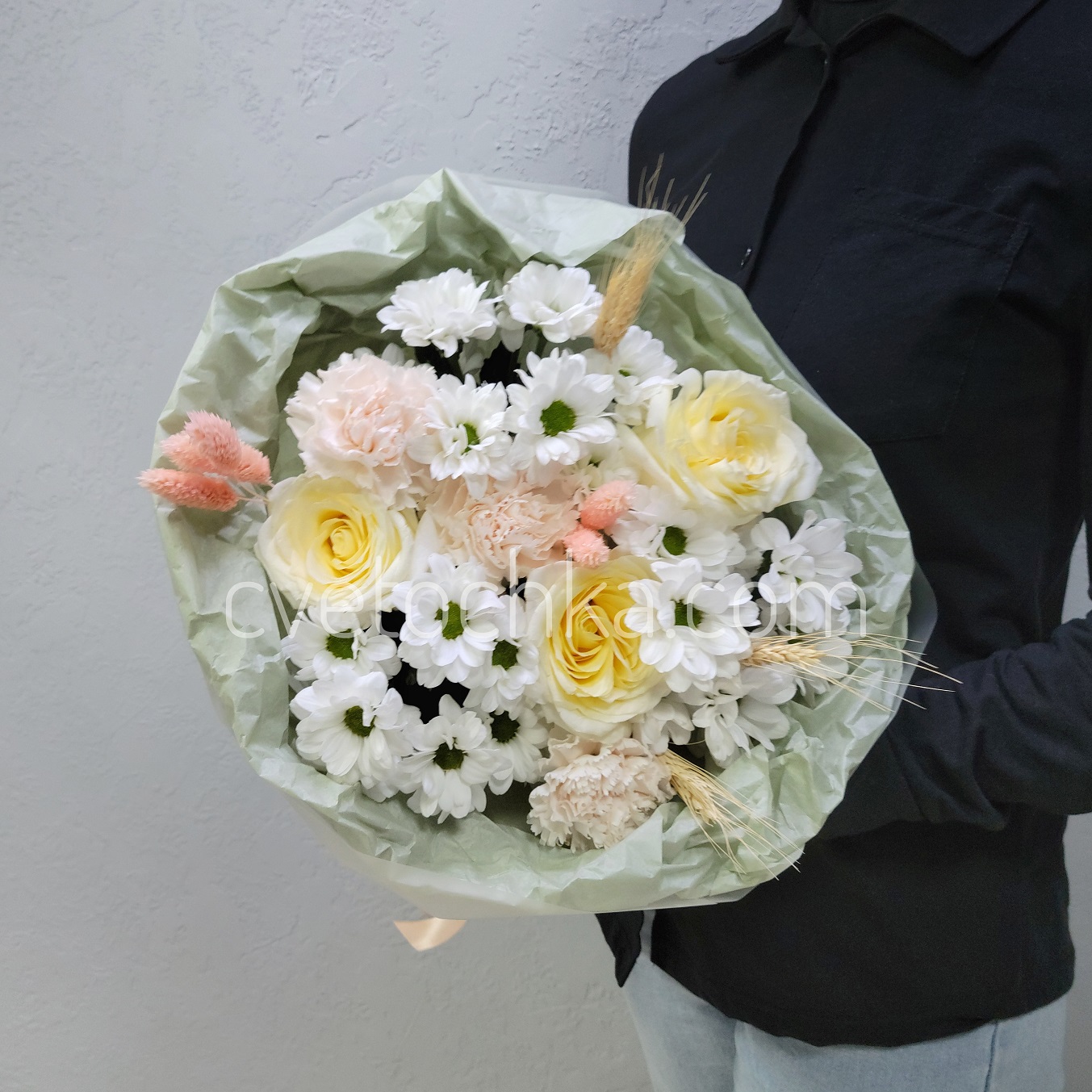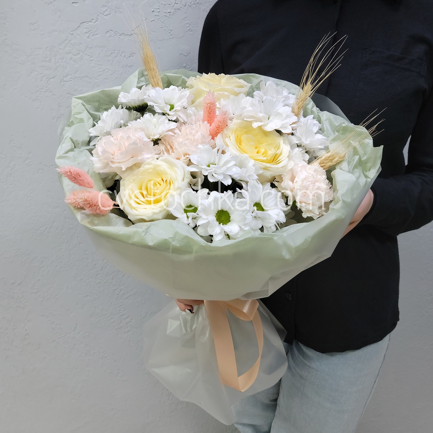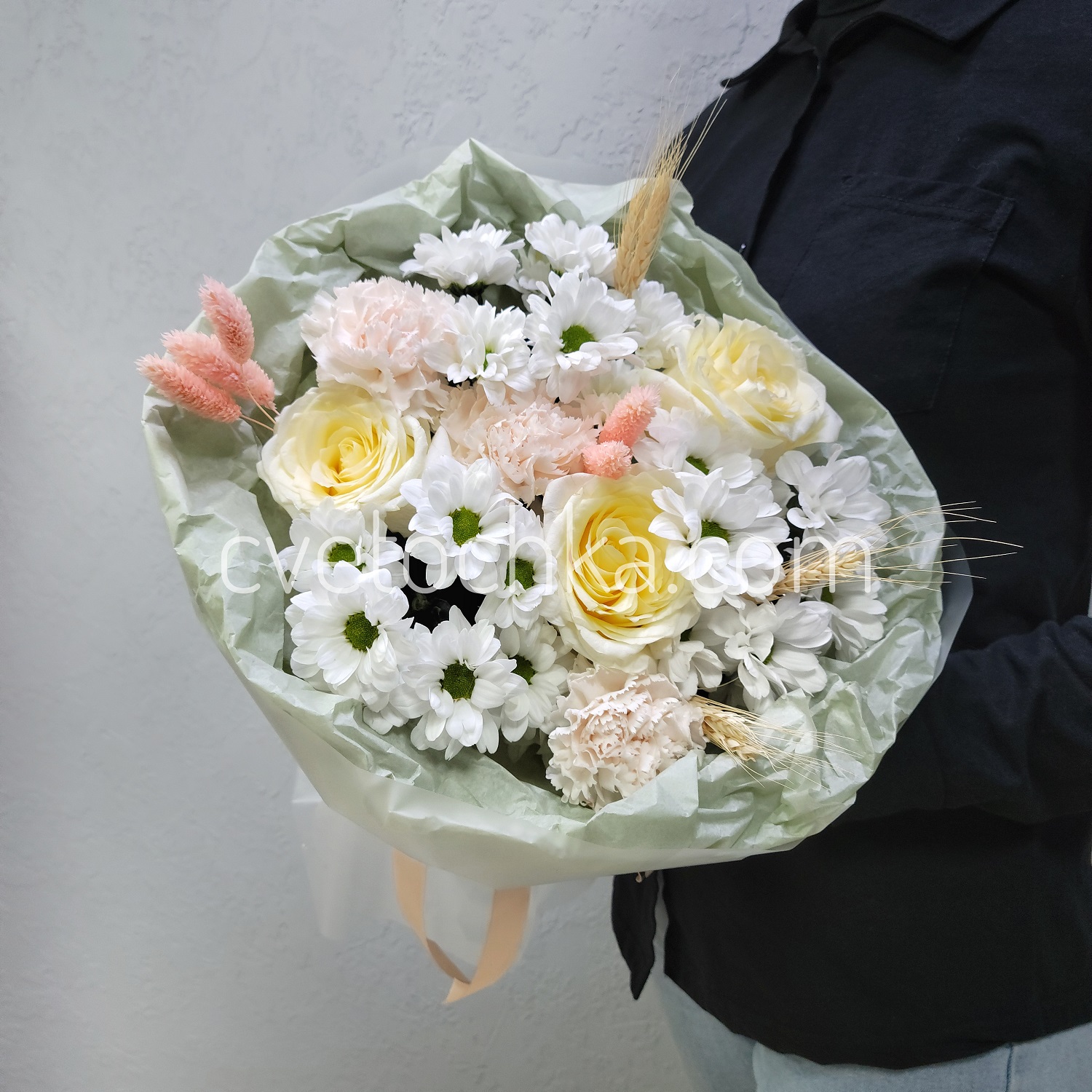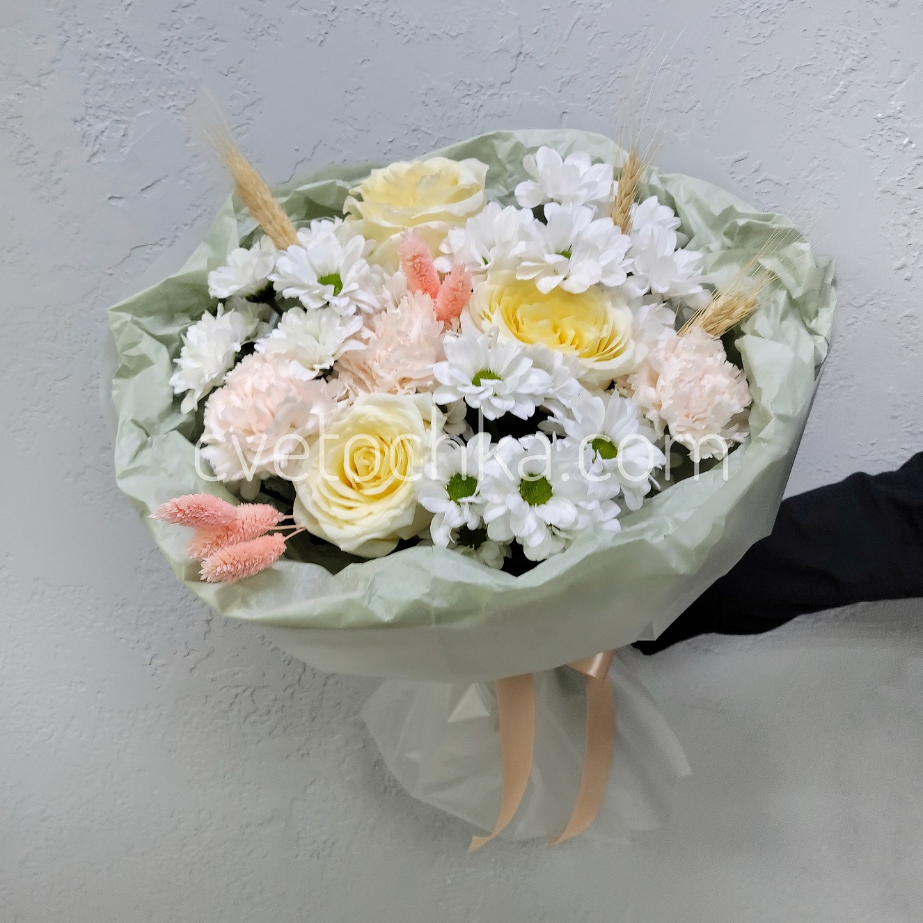 ✔ Идеальный состав: каждый цветок вносит свой вклад. Розы дарят благородность, гвоздики добавляют фактуру, кустовые хризантемы придают букету объем.