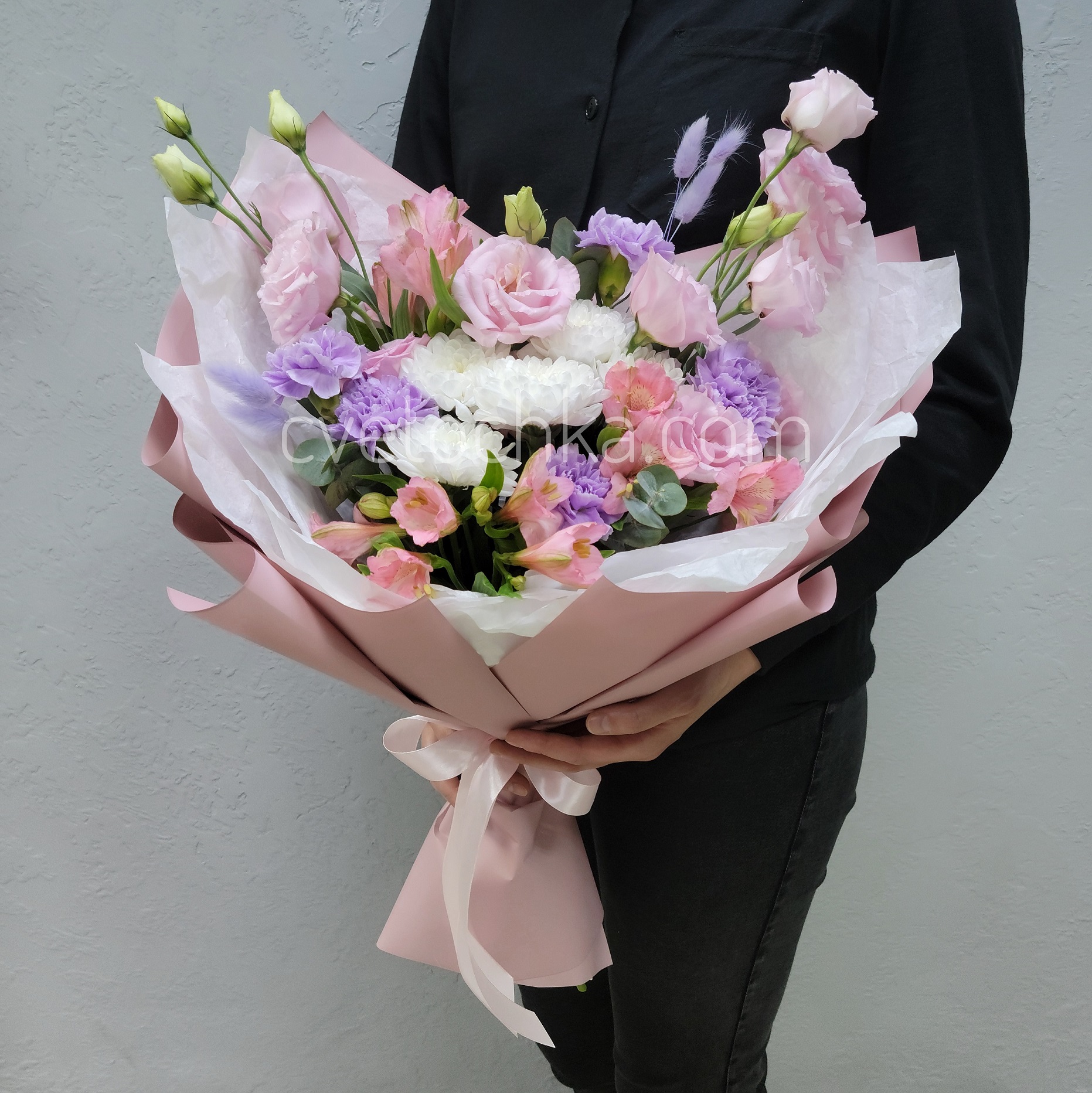 Вы можете купить букет в нежной гамме с эустомой и лунными гвоздиками с доставкой в Челябинске или оформить самовывоз из любого нашего магазина.