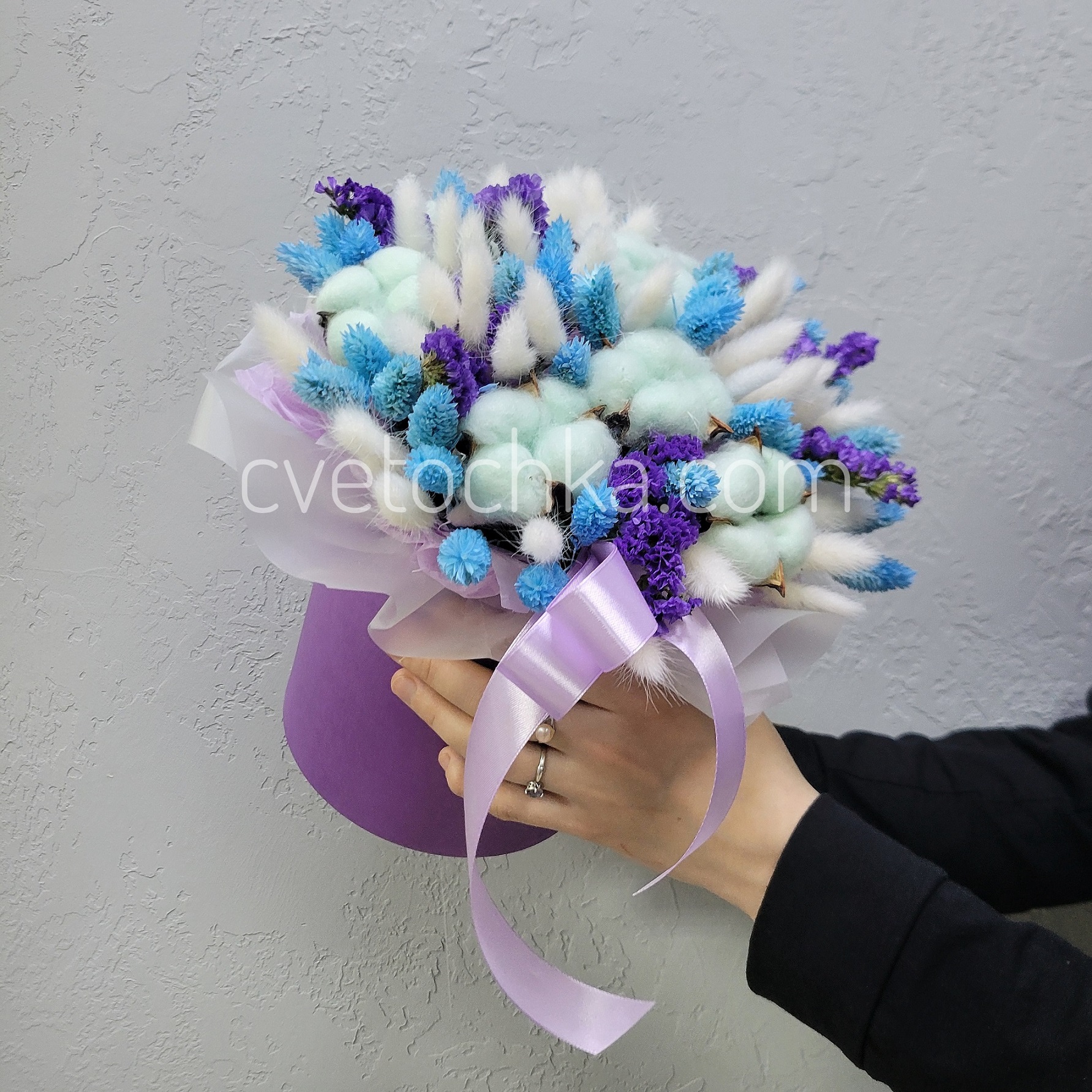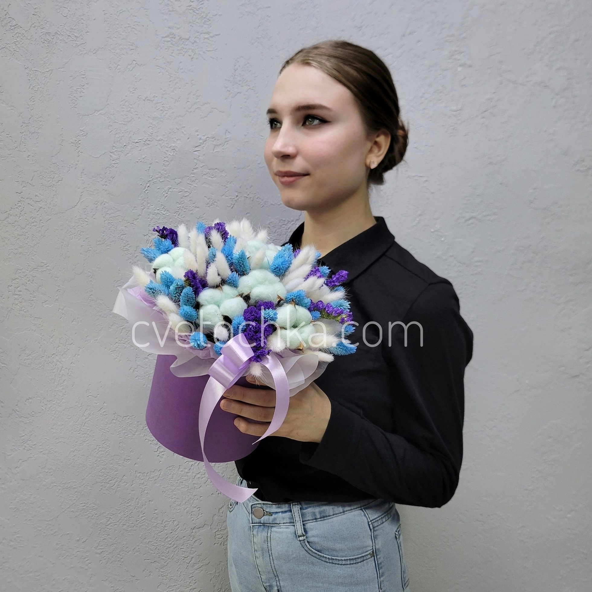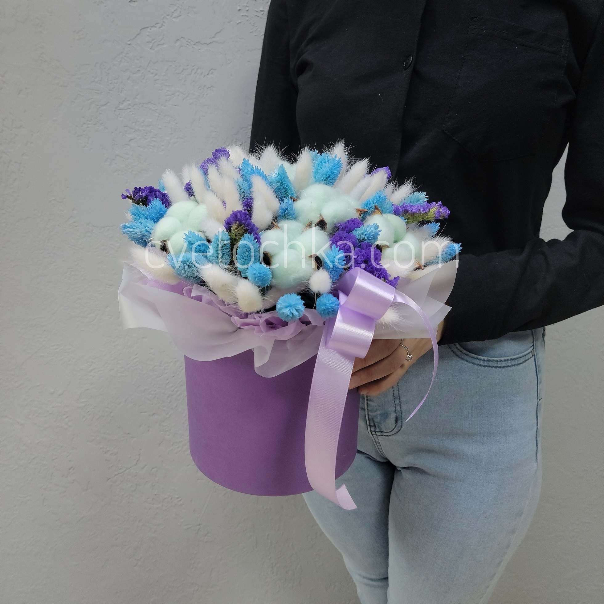 Вы можете купить сухоцветы в шляпной коробке с доставкой в Челябинске или оформить самовывоз из любого нашего магазина.