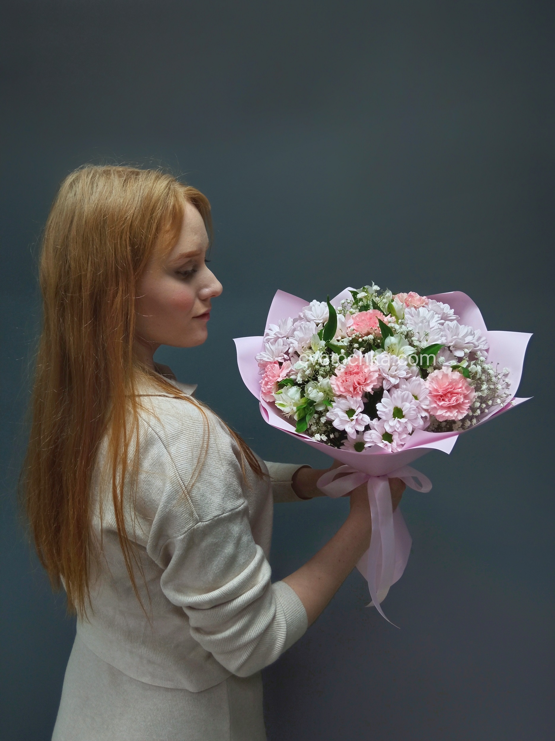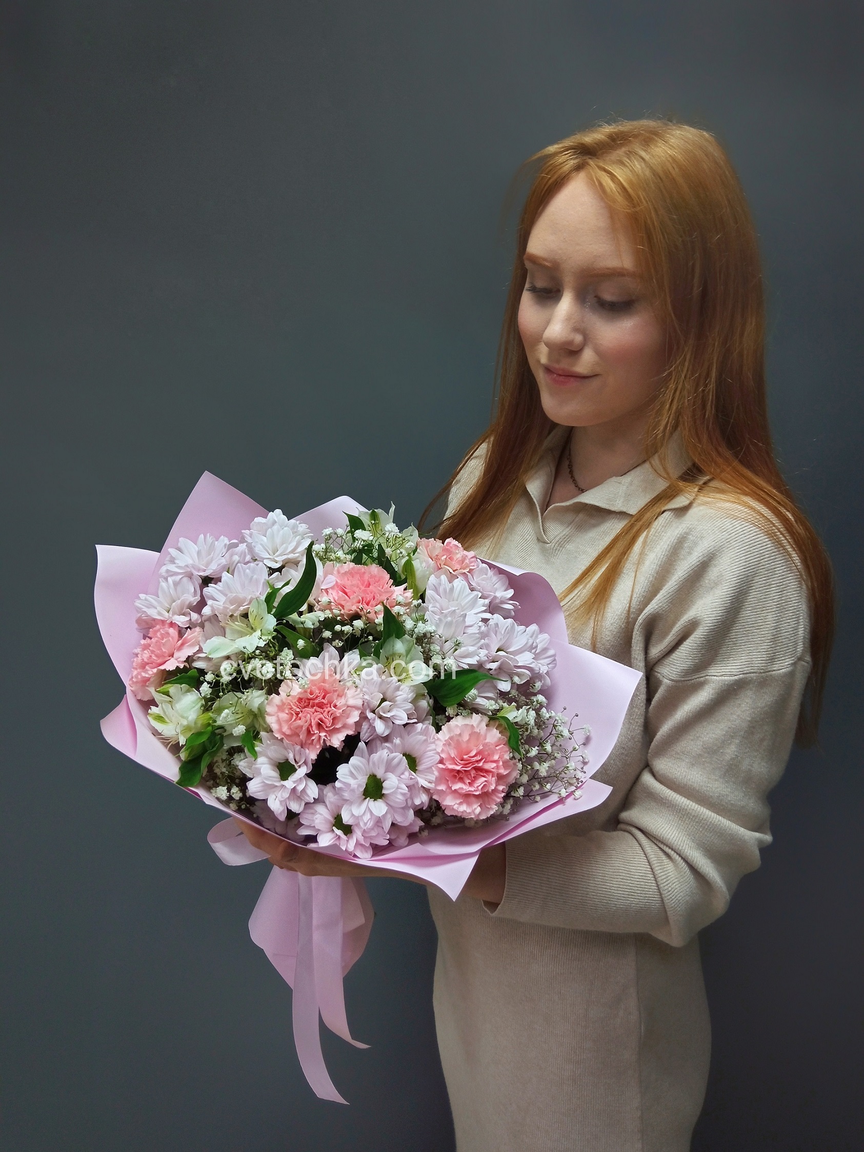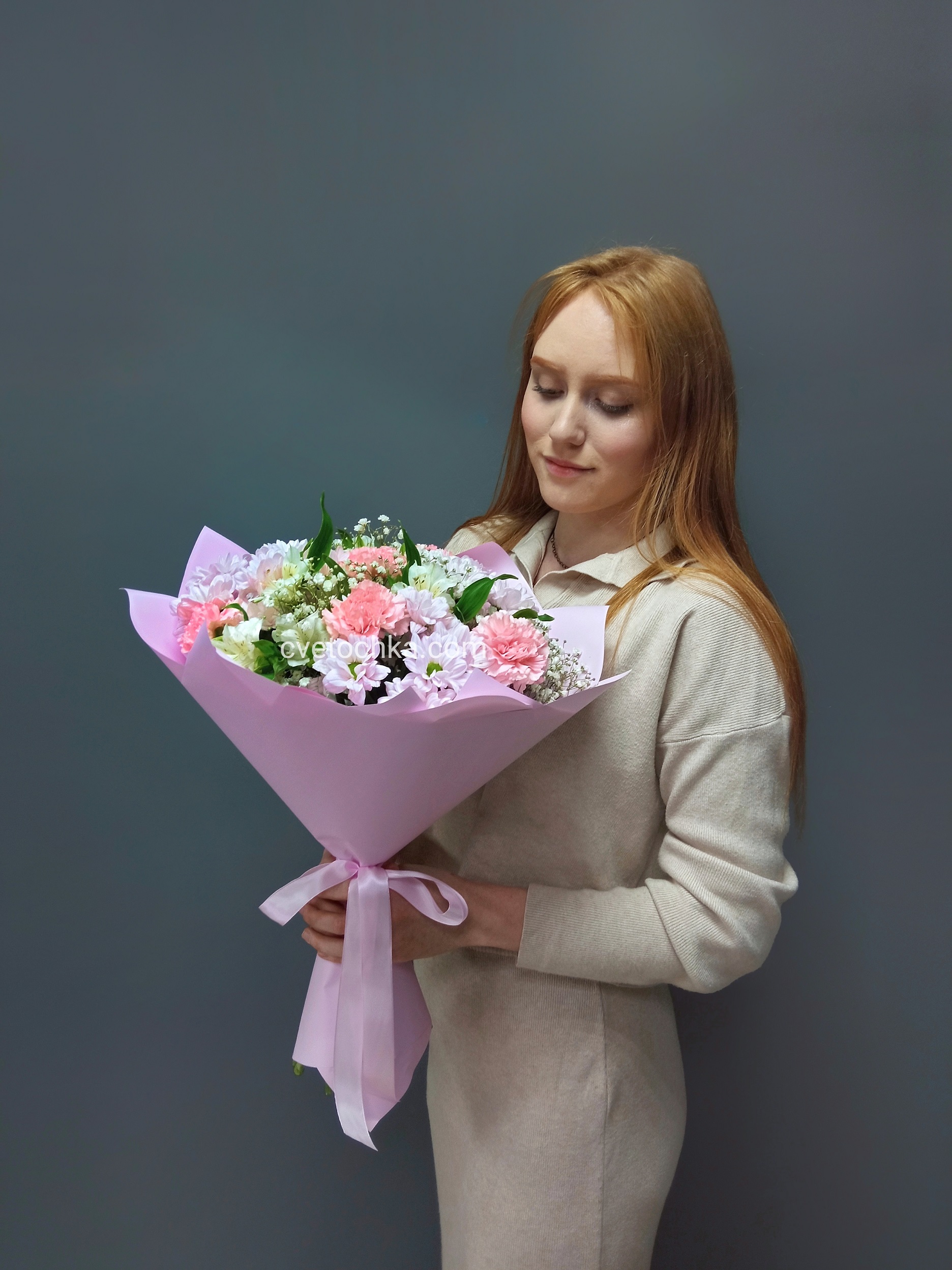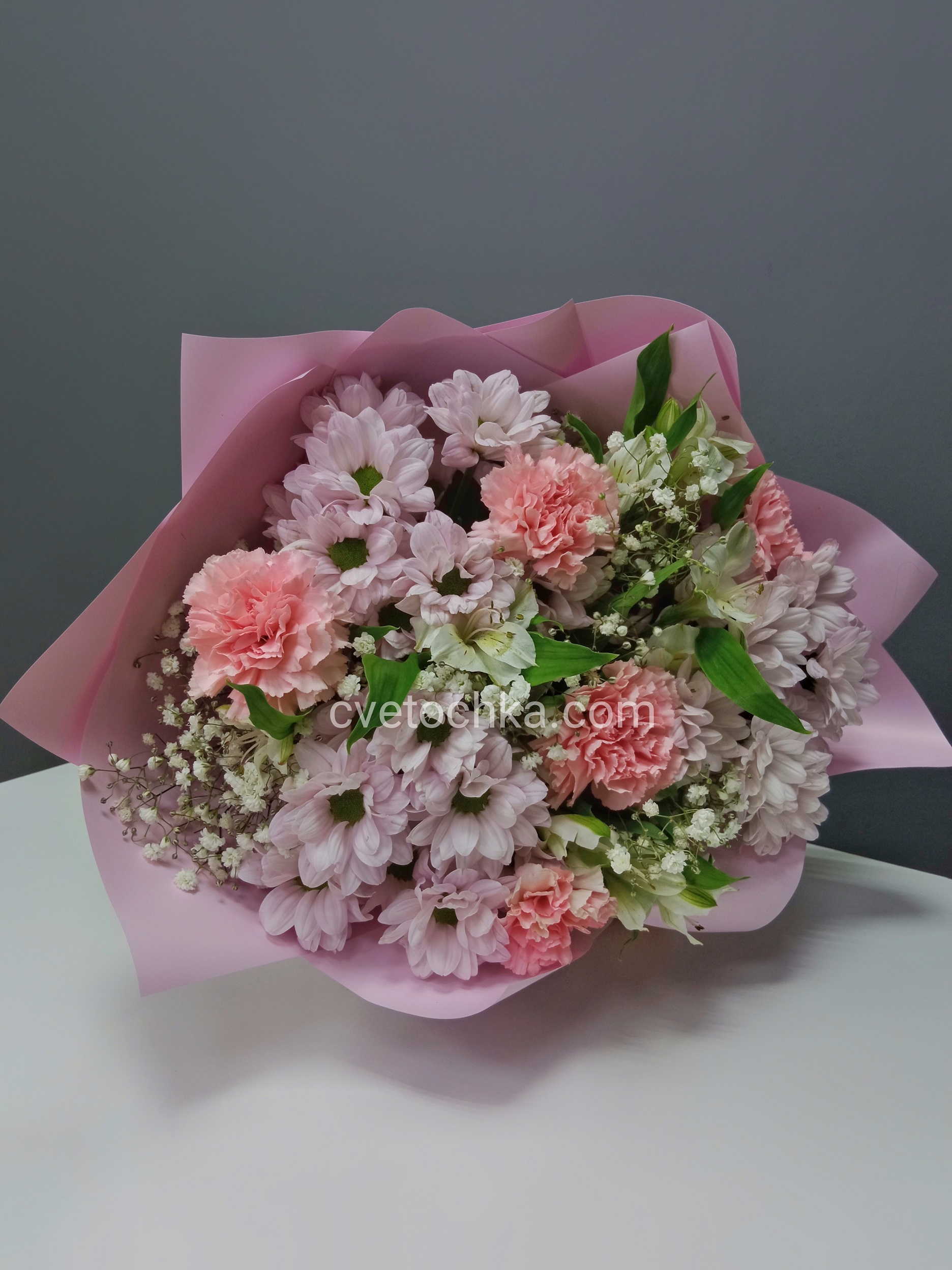 "Хлоя" букет из кустовых хризантем, гвоздик, альстромерий и гипсофилы