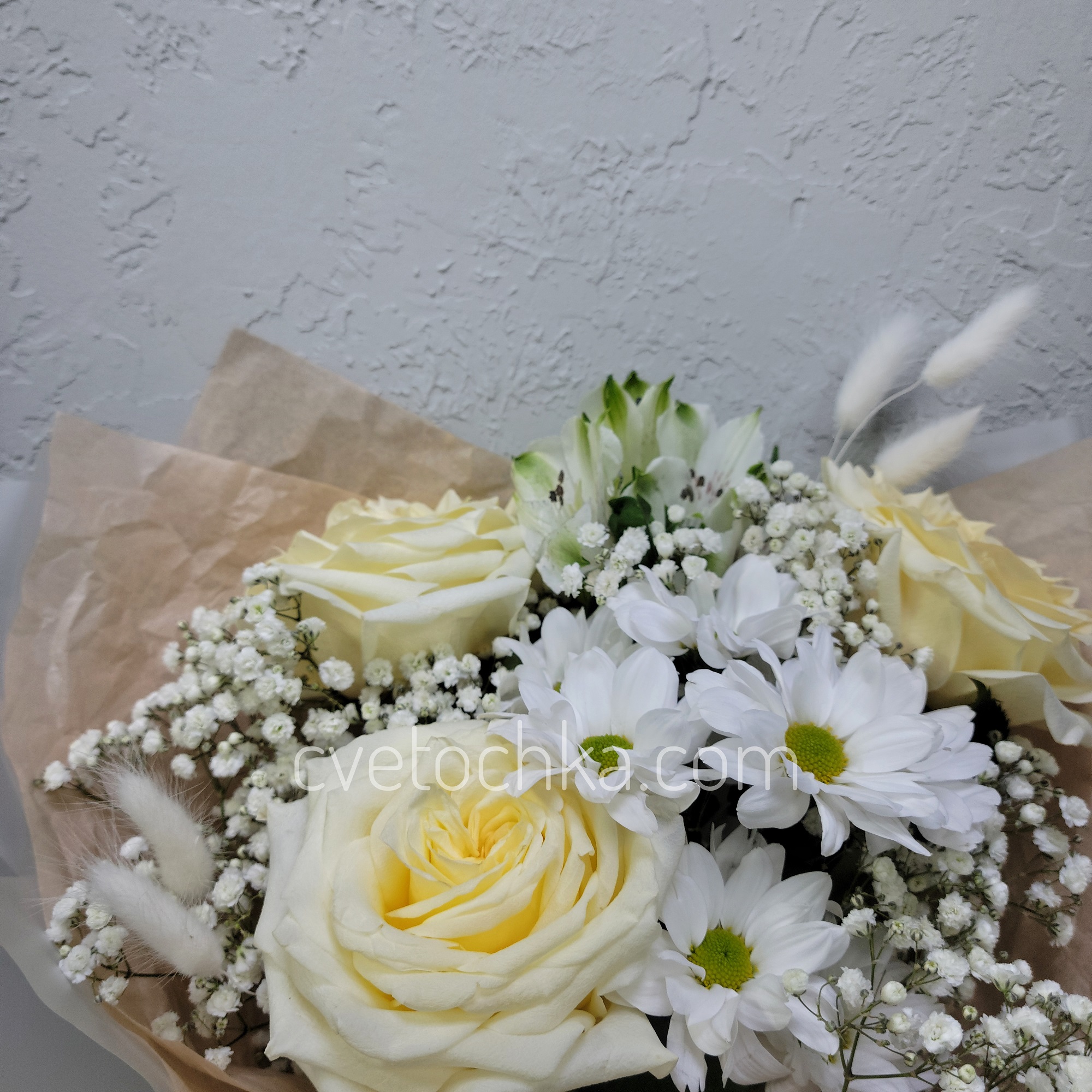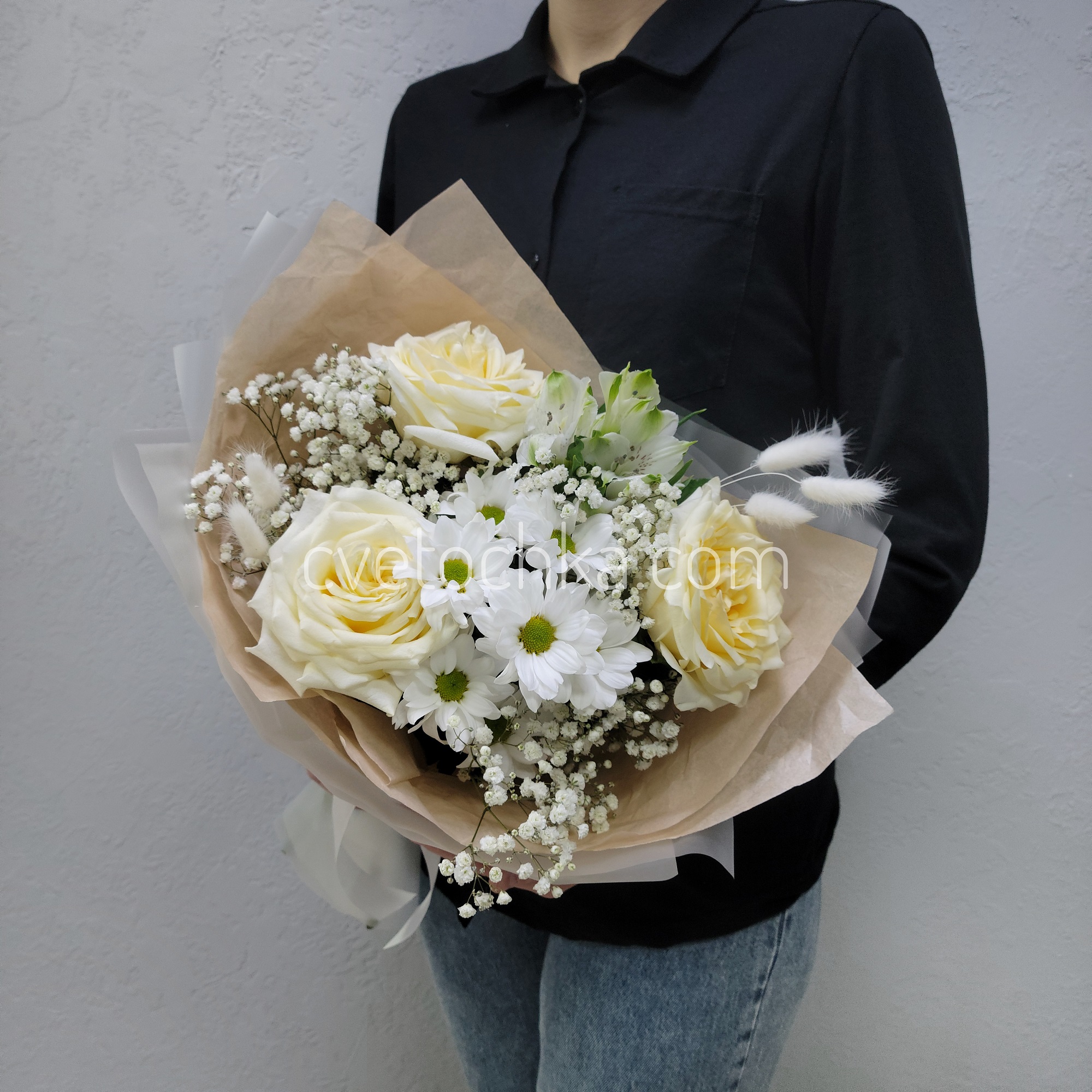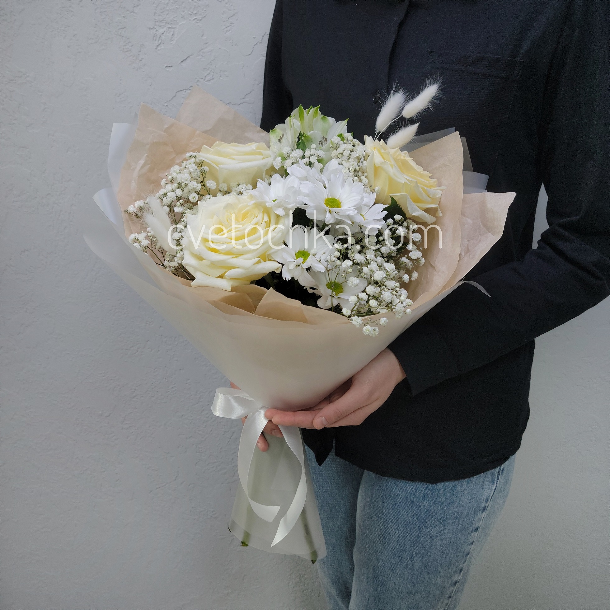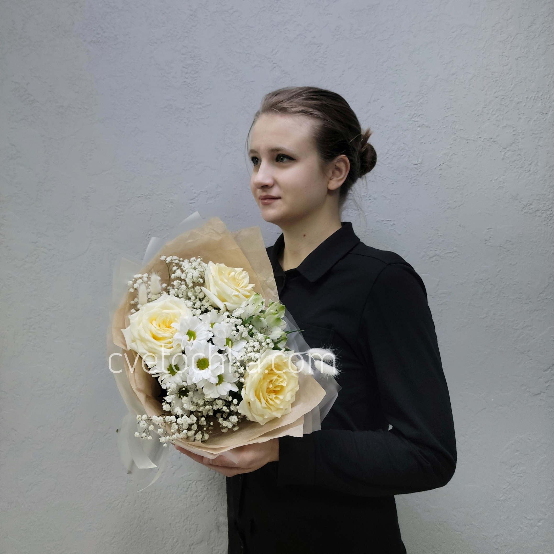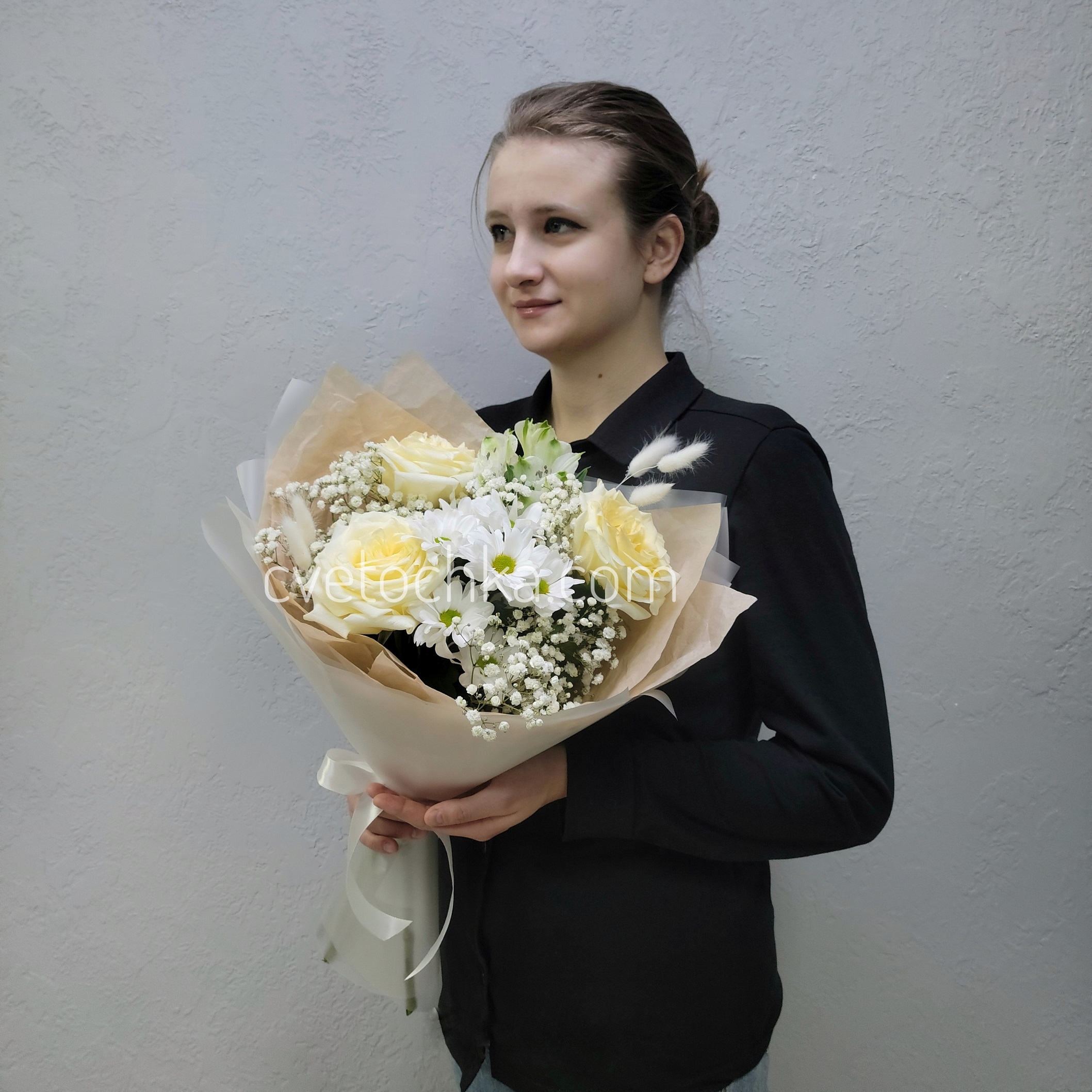 Вы можете купить букет в бело-сливочной гамме с розами с доставкой в Челябинске или оформить самовывоз из любого нашего магазина.