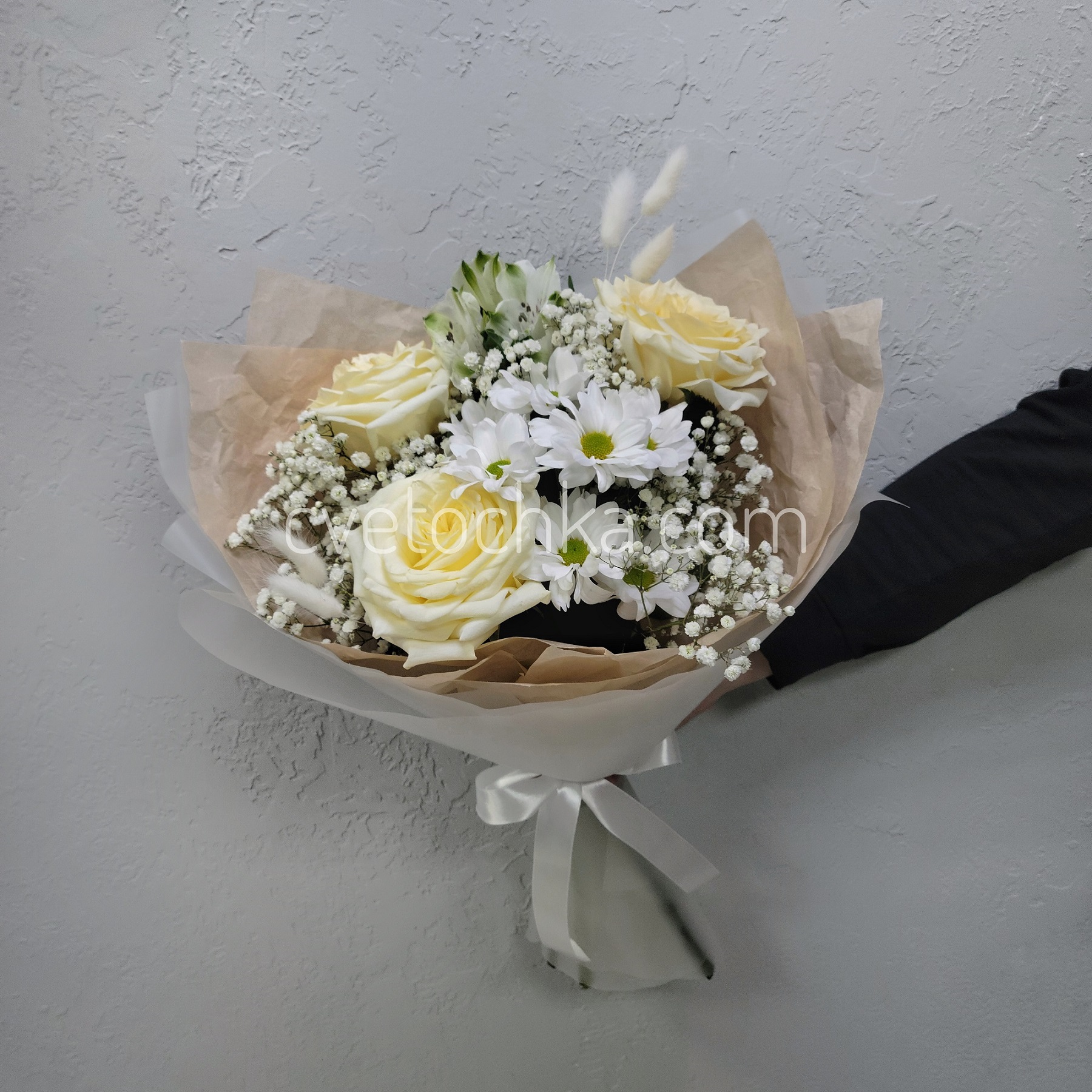 "Белочка" букет с розами, гипсофилой и хризантемой