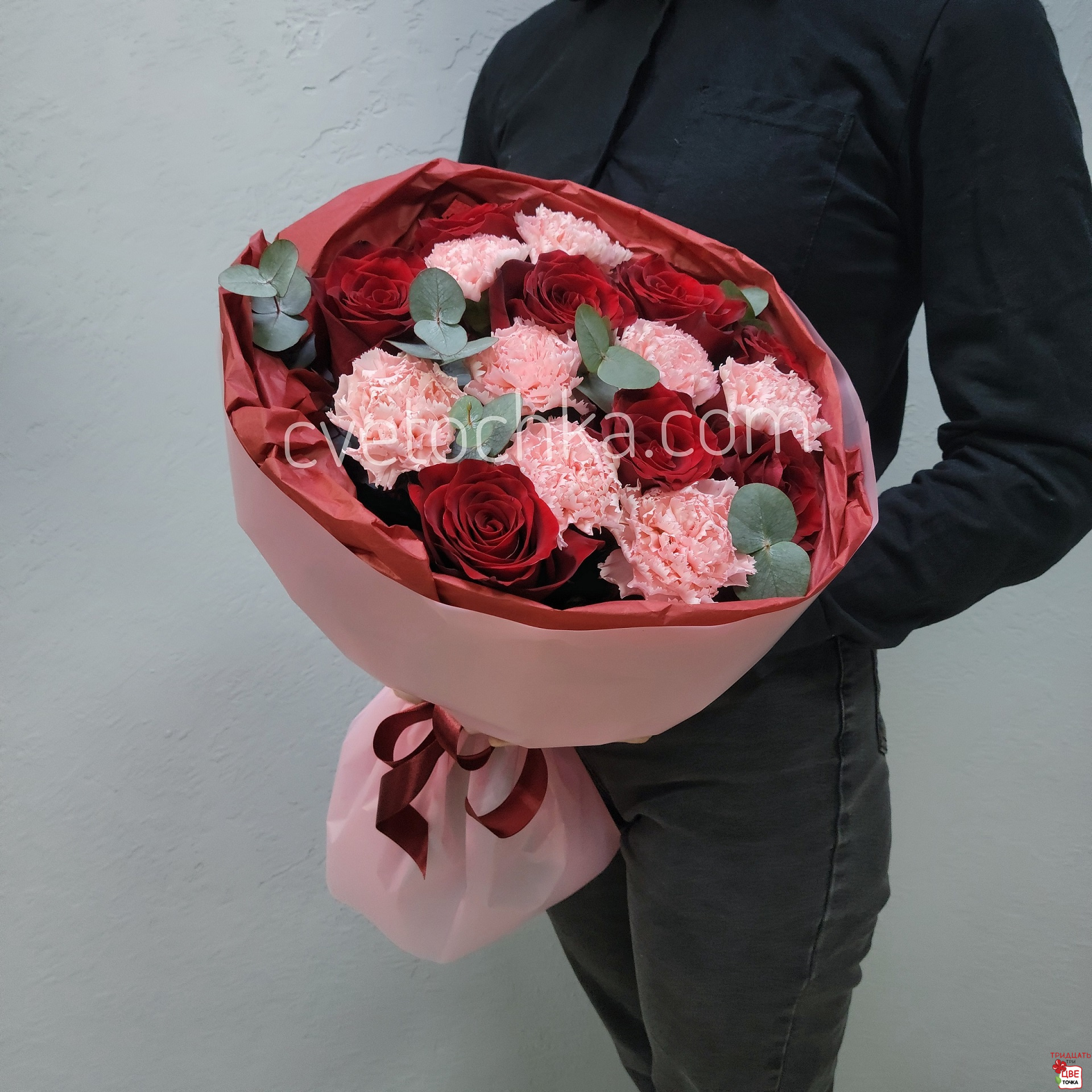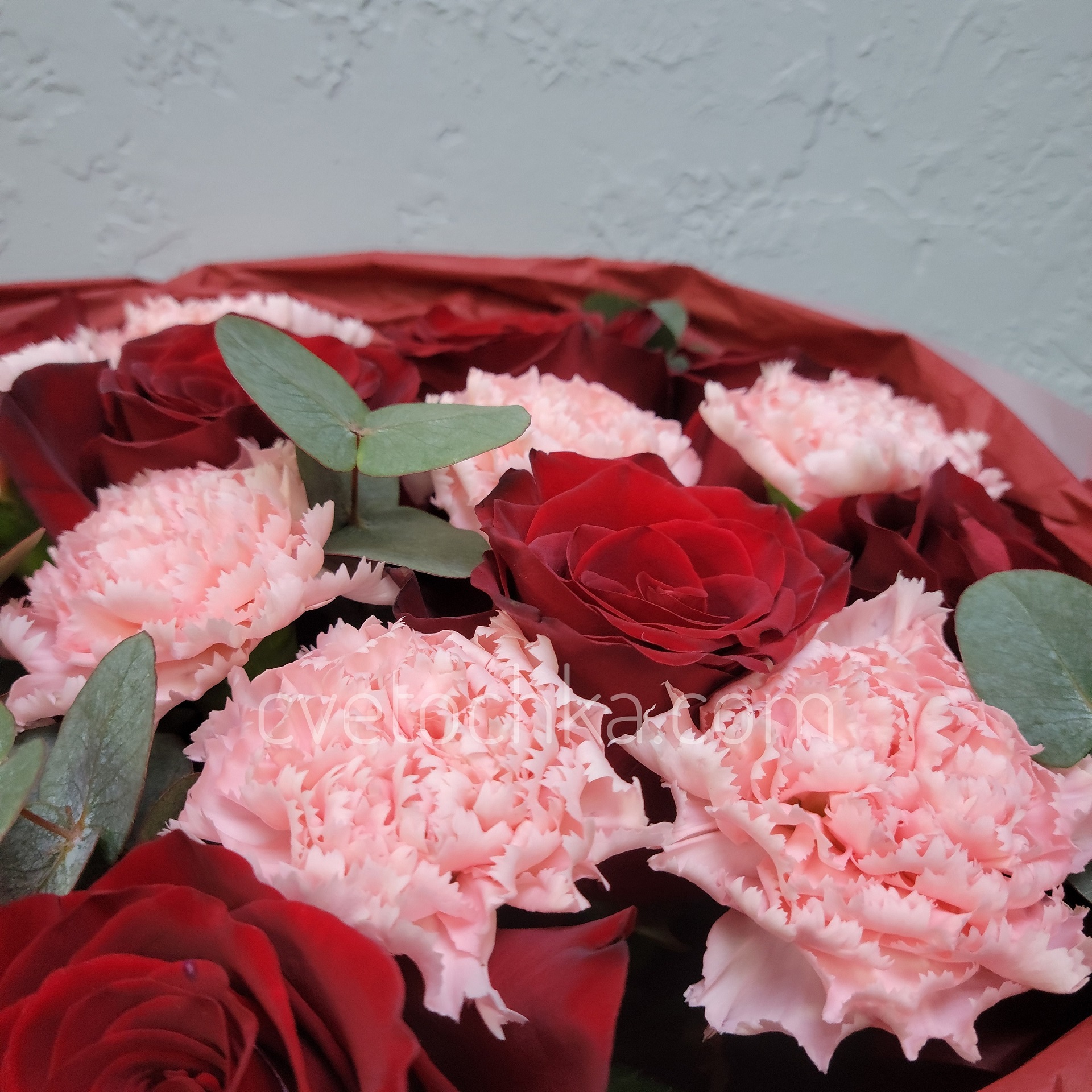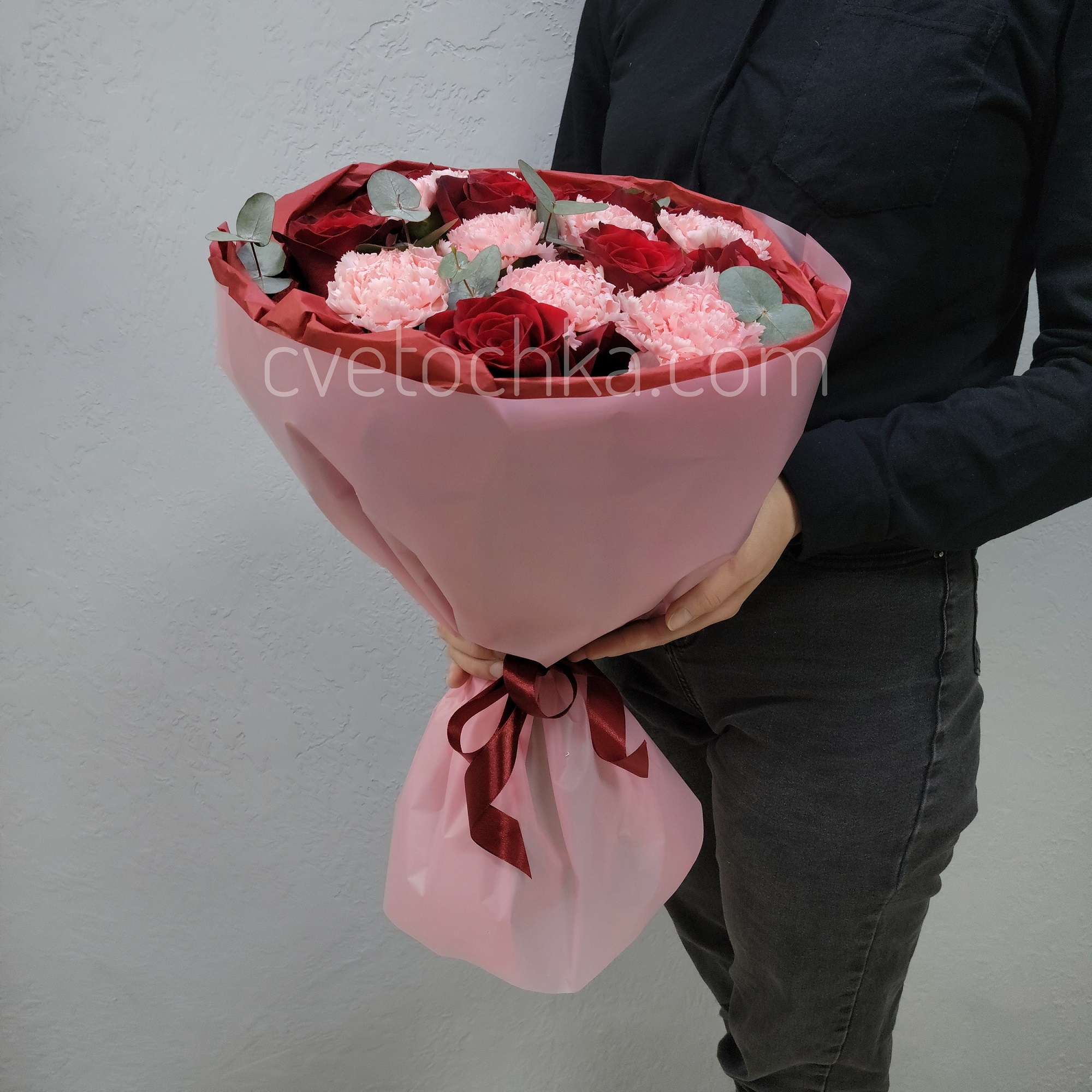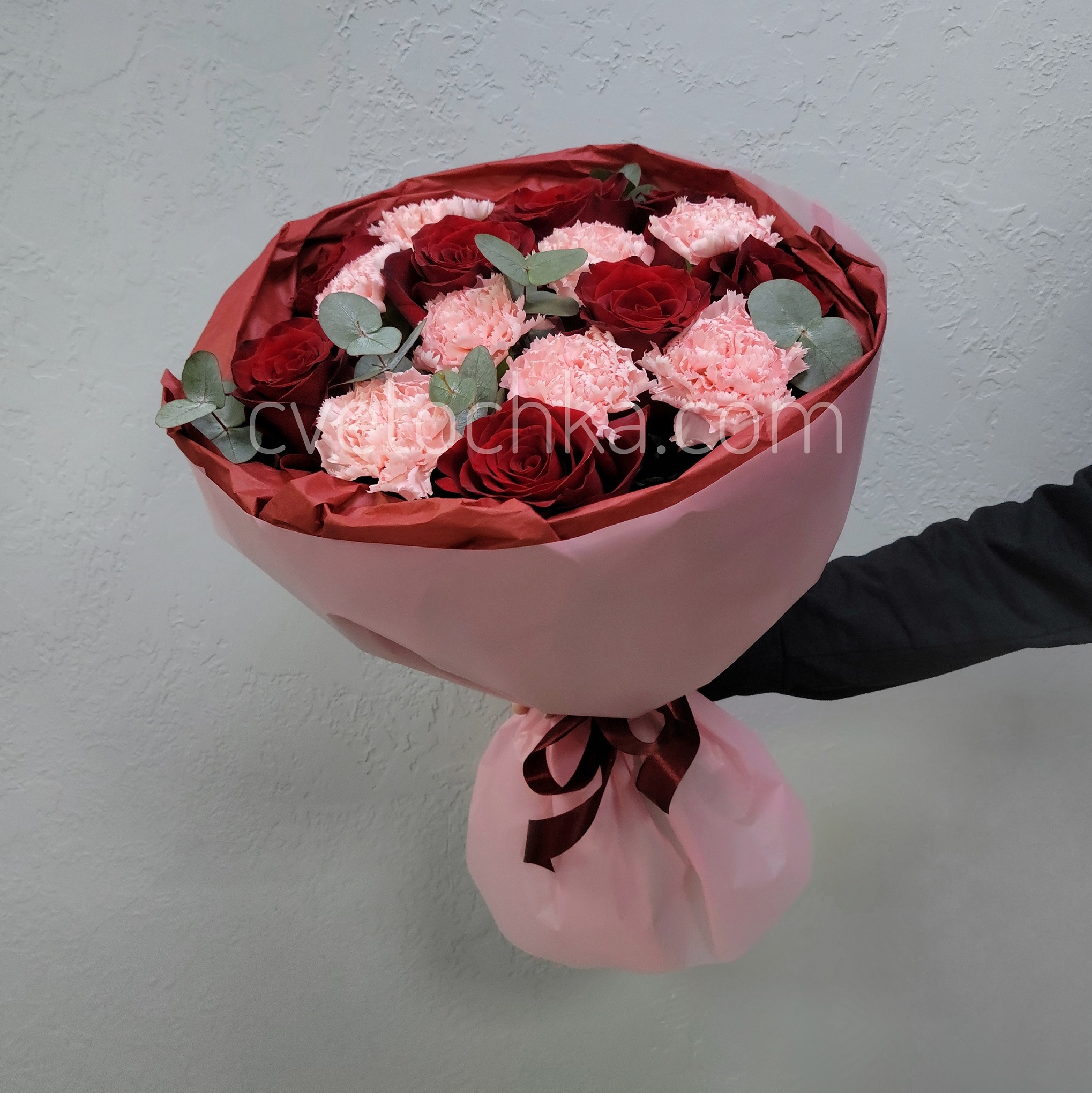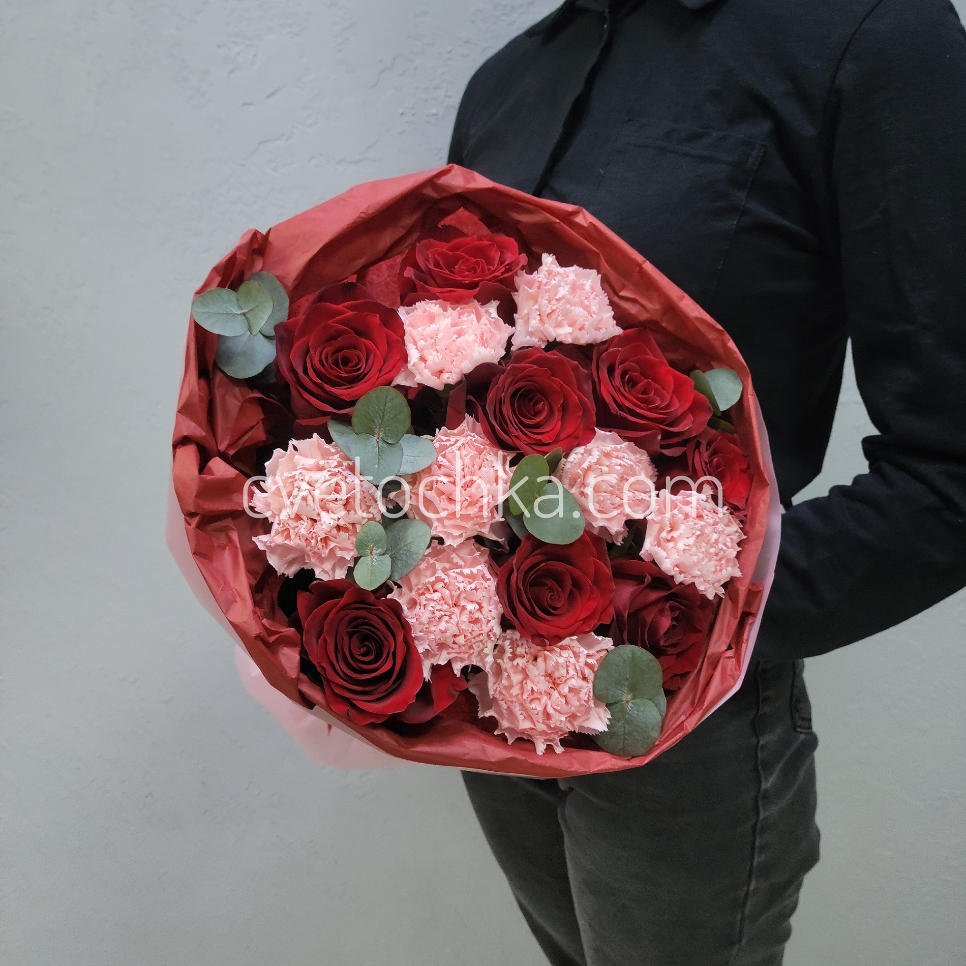 Вы можете купить букет с красными розами, гвоздиками и эвкалиптом с доставкой в Челябинске или оформить самовывоз из любого нашего магазина.