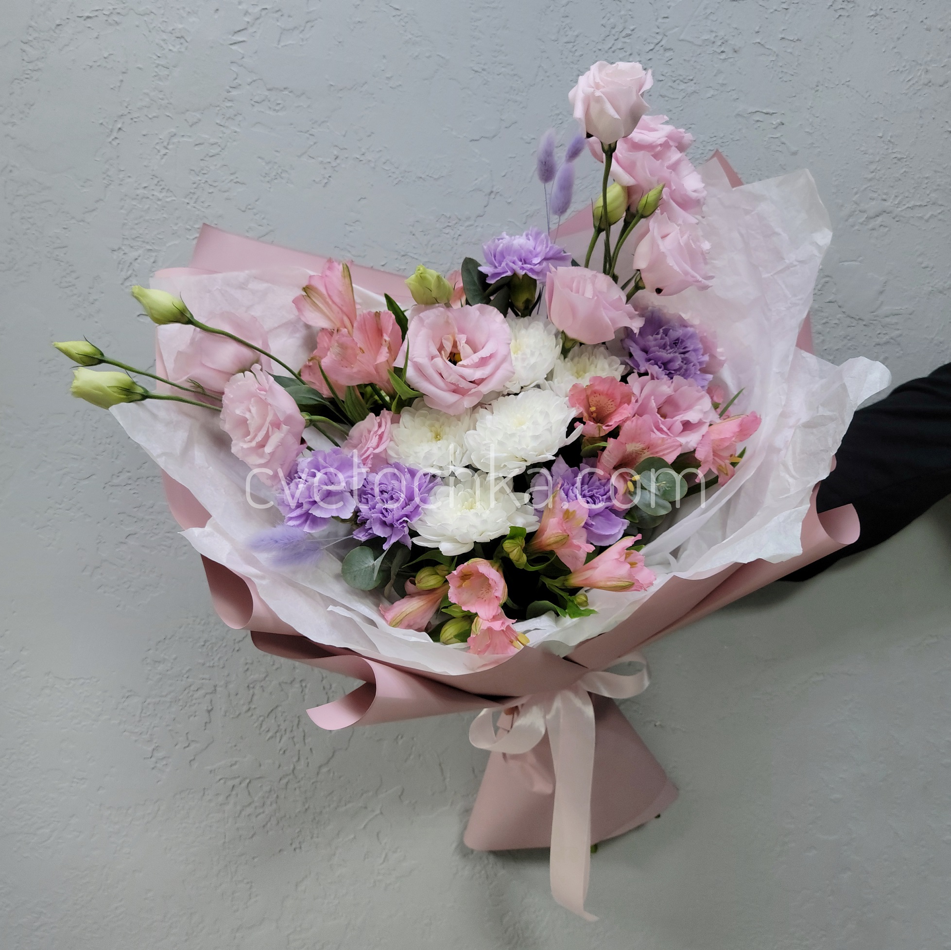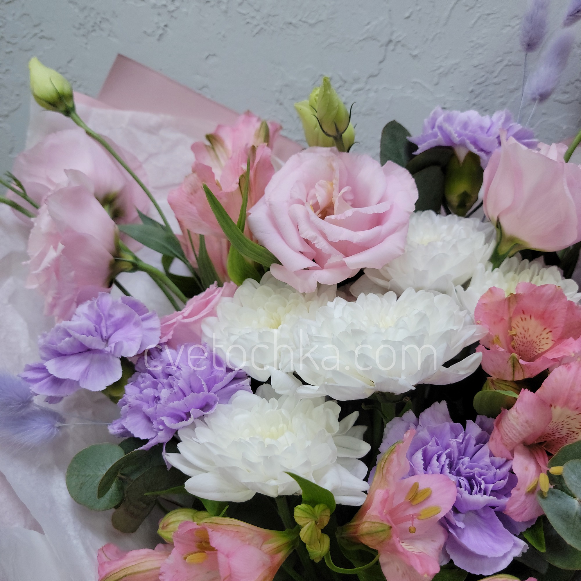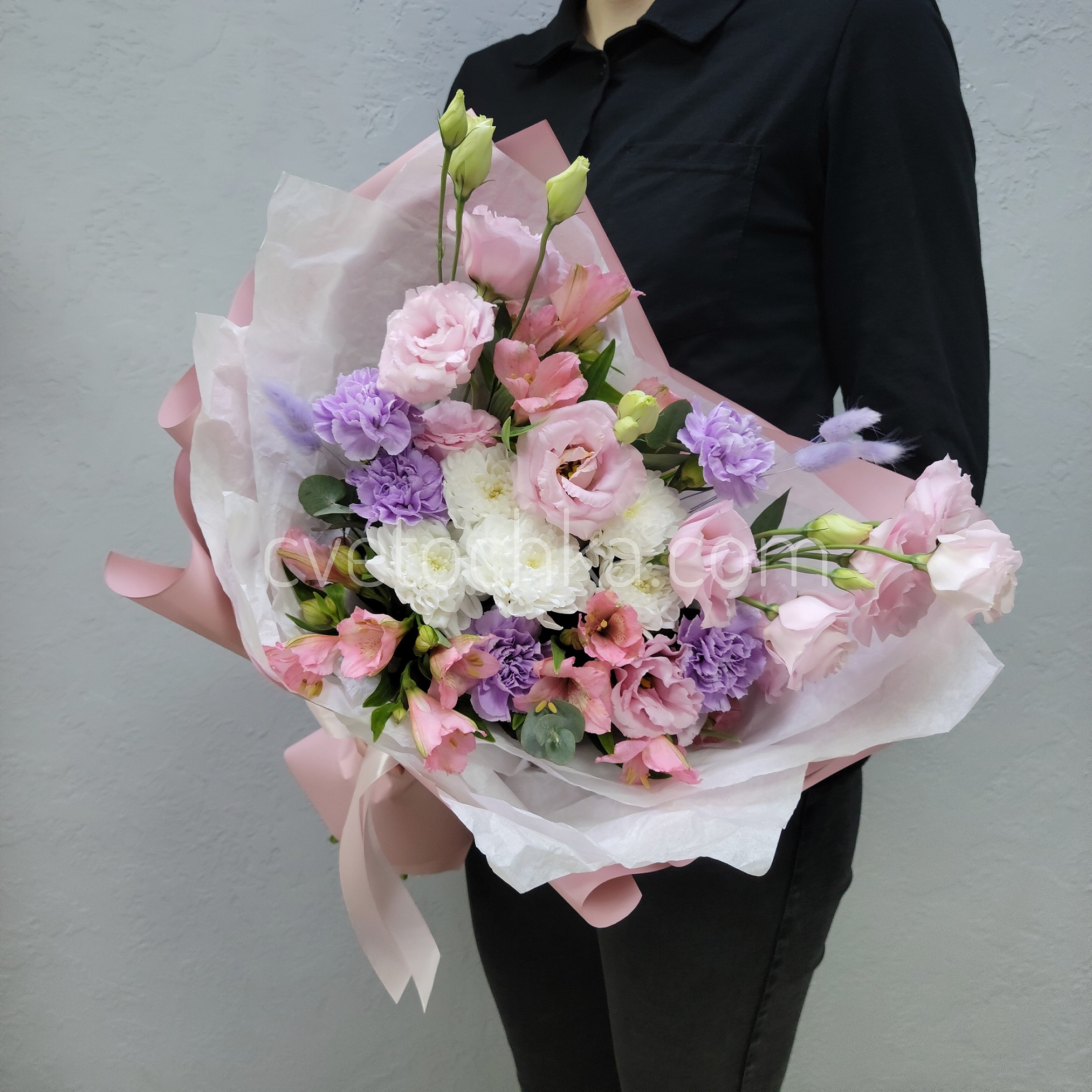 Вы можете купить букет в нежной гамме с эустомой и лунными гвоздиками с доставкой в Челябинске или оформить самовывоз из любого нашего магазина.